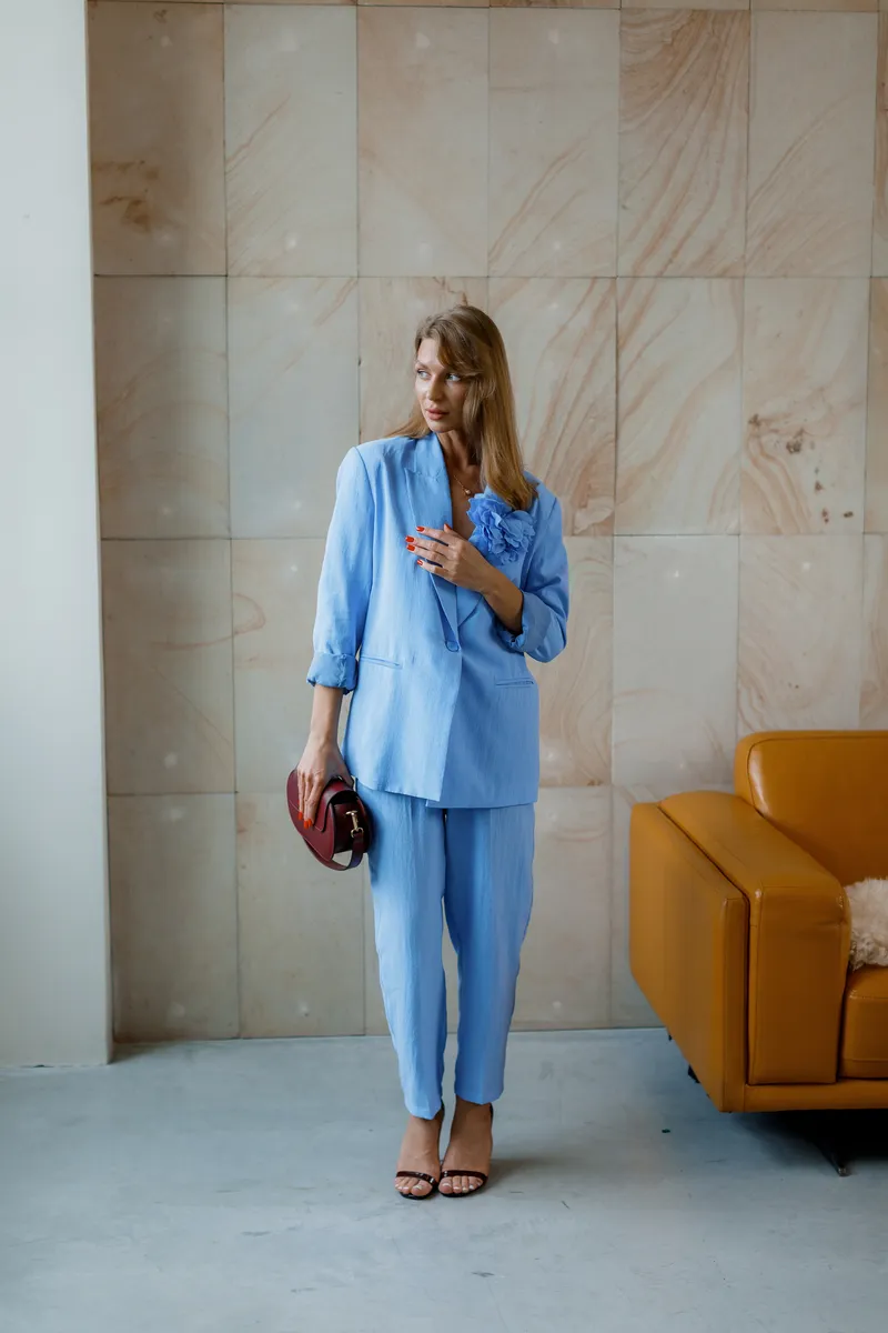 Блакитний колір надає свіжості й легкості образу, роблячи ці брюки універсальним вибором як для ділового, так і для повсякденного стилю.