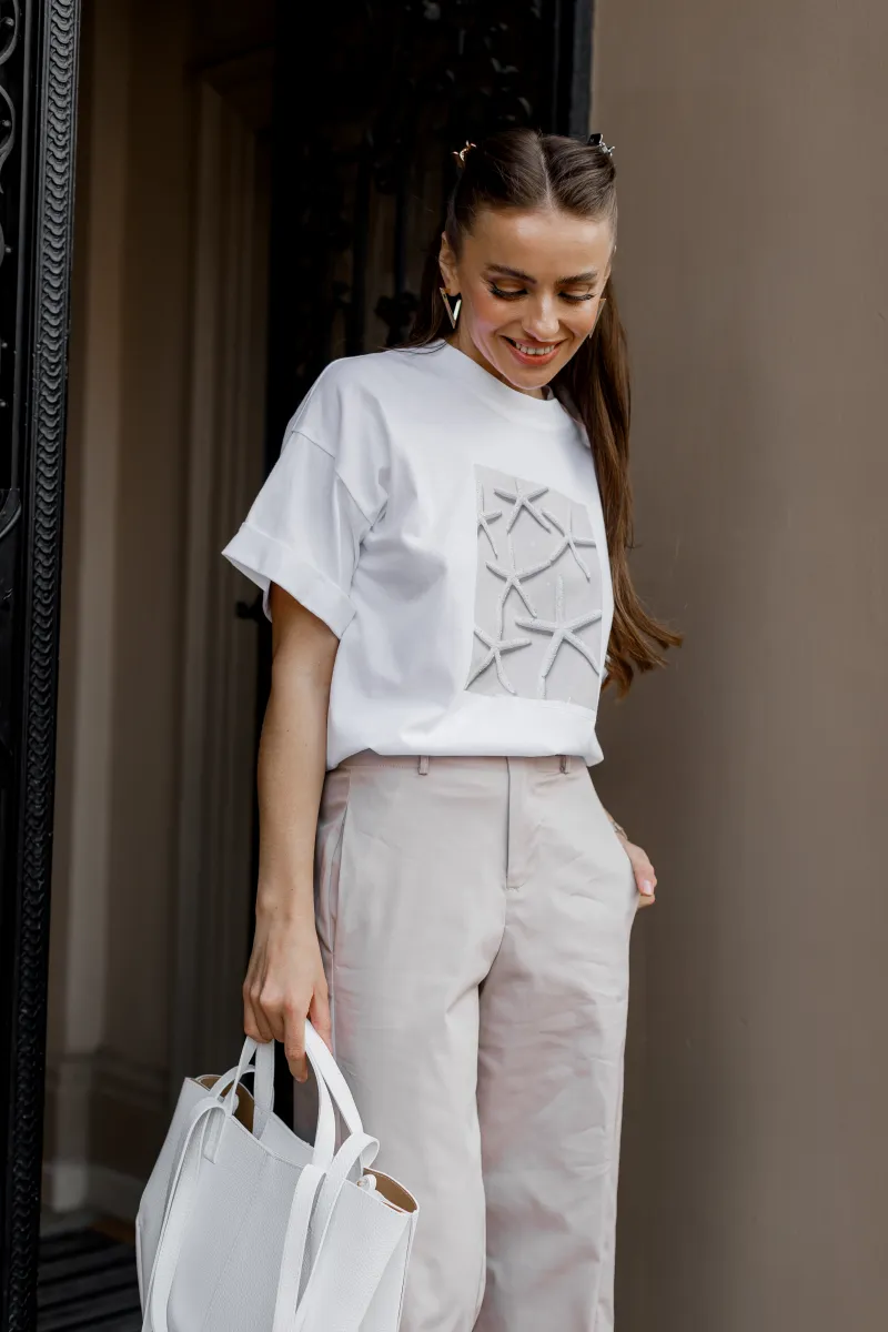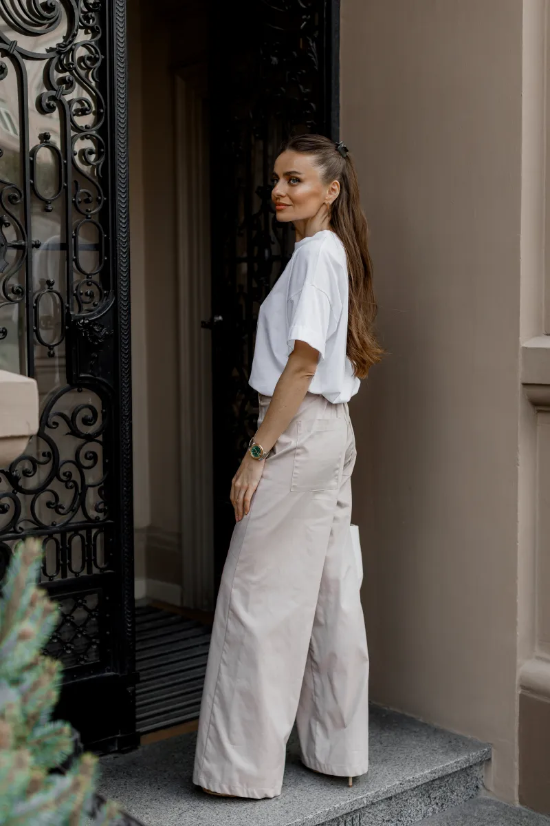 Світлі штани — ідеальна база для Вашого стильного гардероба. Вони поєднують стриману елегантність з сучасним силуетом, що підкреслює талію та додає образу витонченості. Вільний крій забезпечує комфорт протягом усього дня, а універсальний відтінок легко комбінується з будь-яким верхом — від класичних сорочок до casual-футболок.