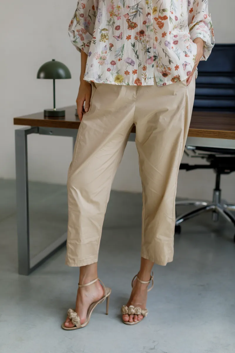 Універсальні штани бежевого кольору з 100% котону — ідеальне рішення для створення комфортного щоденного образу. Модель має прямий укорочений крій, посадка середня, зручні кишені з боків, стриманий та елегантний дизайн без зайвих деталей. Підійдуть як для офісу, так і для прогулянок у місті.