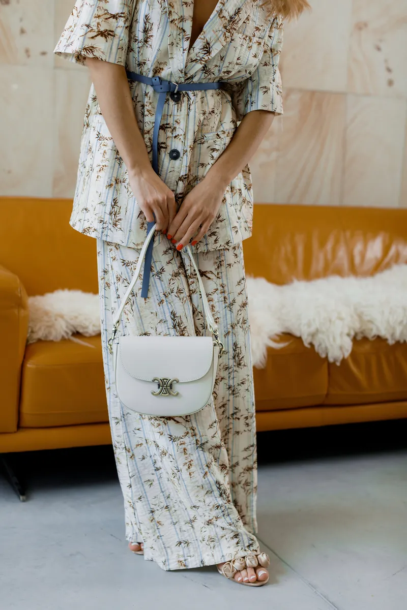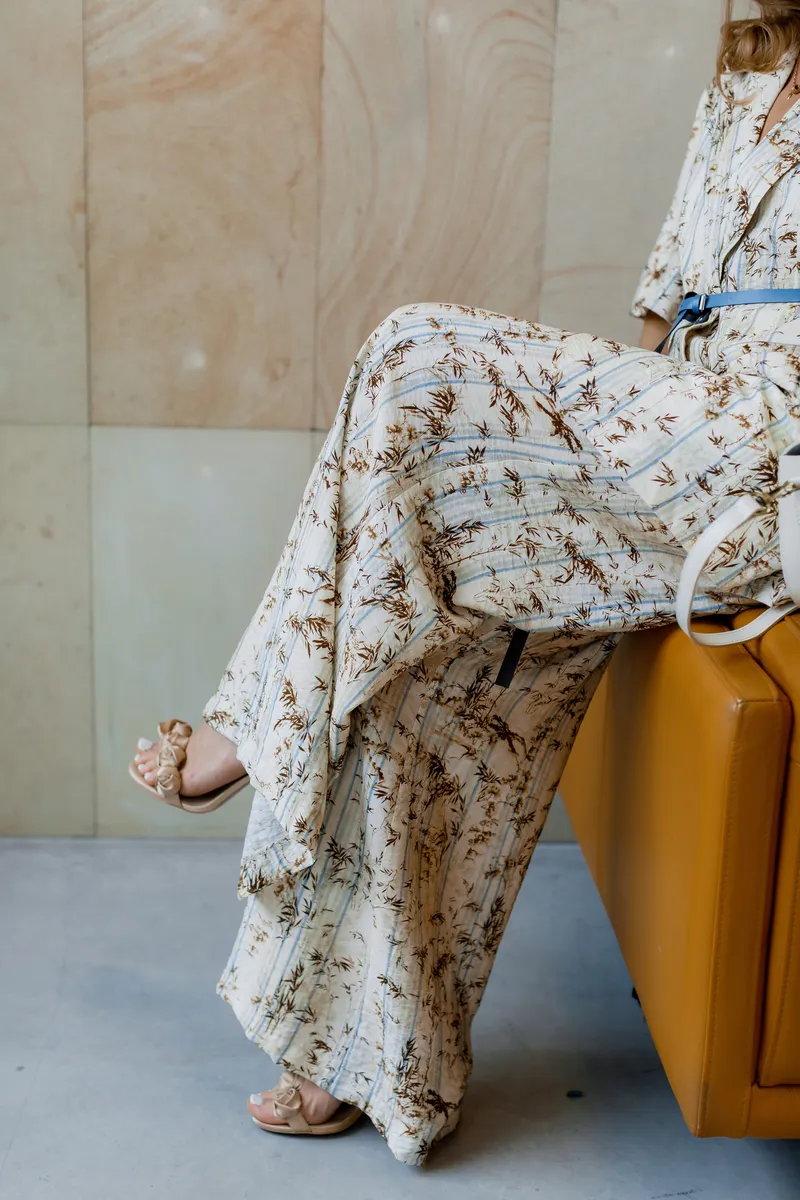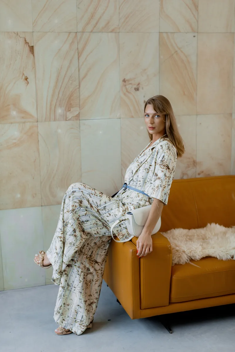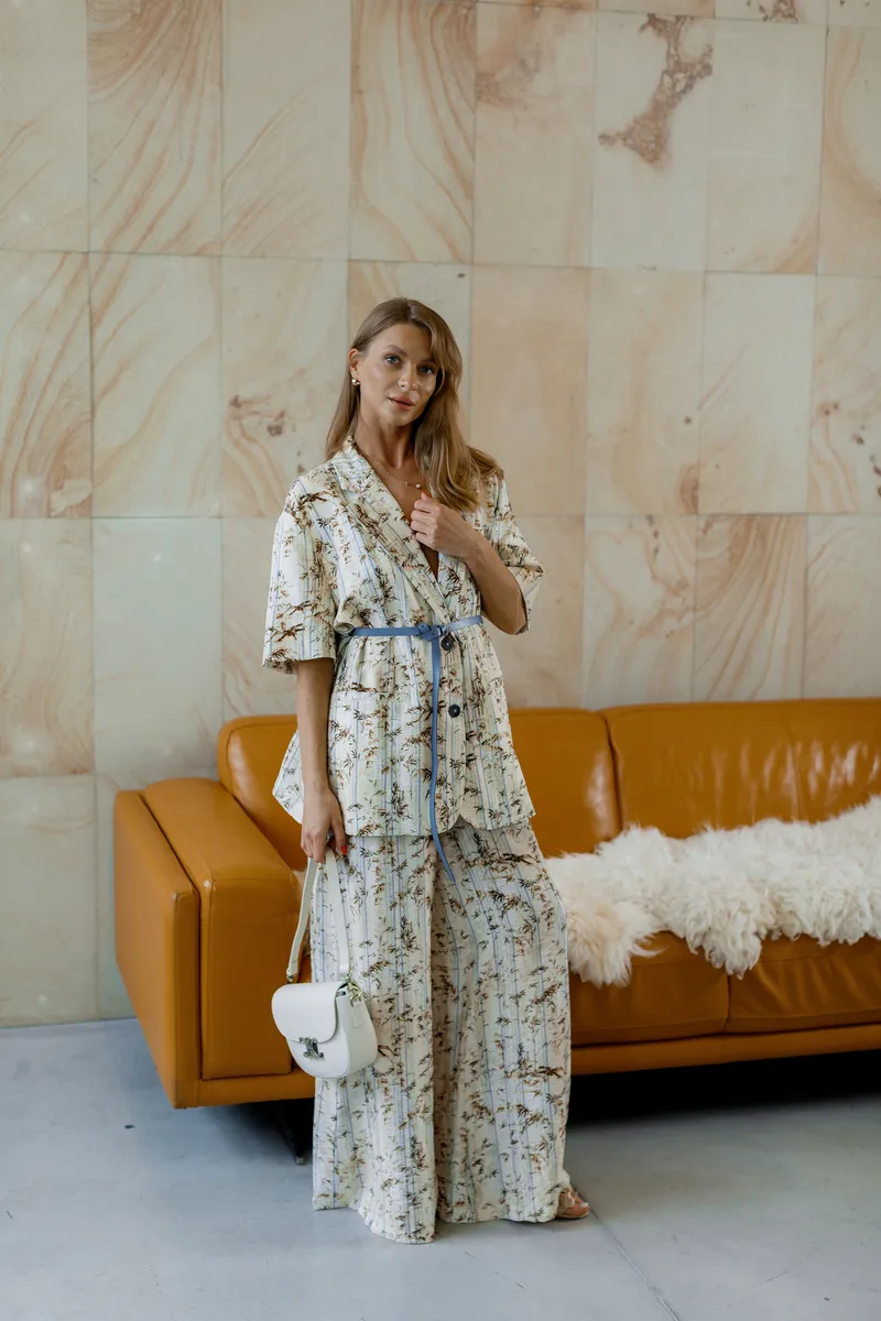 Рослинний принт у природних відтінках створює літній настрій і гармонійно доповнює піджак з цього ж комплекту.