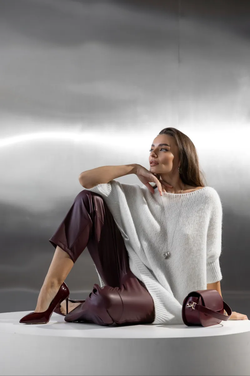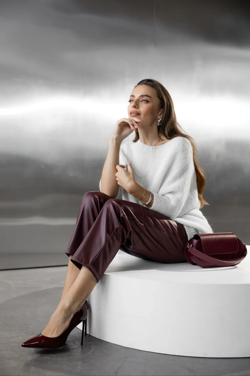 Ці штани поєднують у собі елегантність та комфорт. Виготовлені з м’якої преміальної екошкіри, вони гарно сідають по фігурі, створюючи витончений силует. Модель з високою посадкою та класичним прямим кроєм підходить як для ділових, так і для повсякденних образів. Застібка на гудзик і блискавку забезпечує зручність, а благородний бордовий відтінок додає вишуканості.