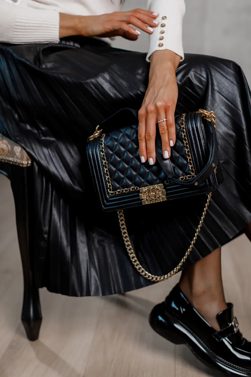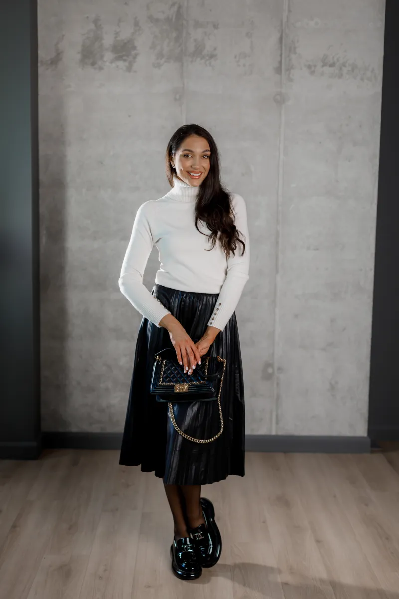 Стильний плісирований крій створює легкість і рухливість, а екошкіра не лише виглядає ефектно, а й є екологічно чистим матеріалом.