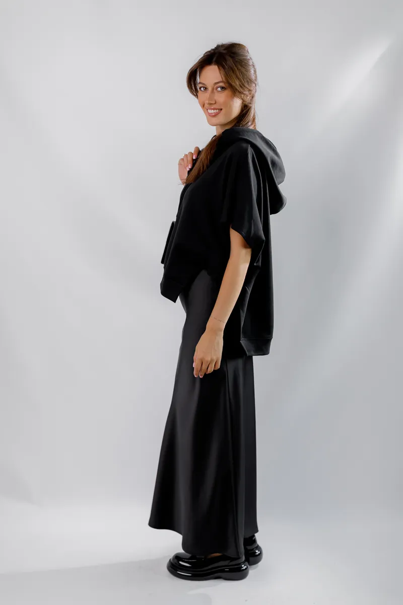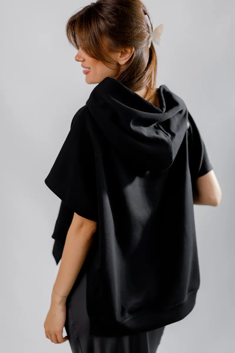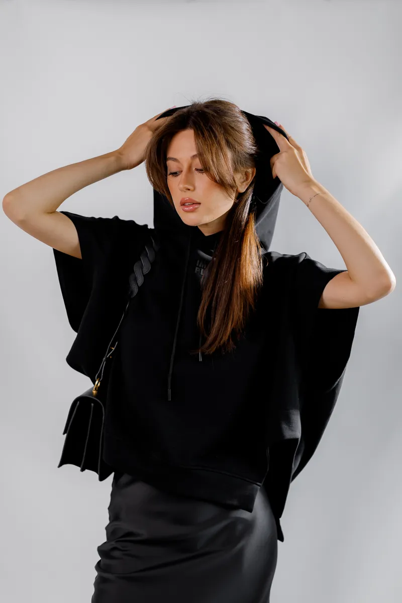 Об'ємний капюшон додає модного акценту, а відсутність рукавів з подовженим плечем створює унікальний силует.