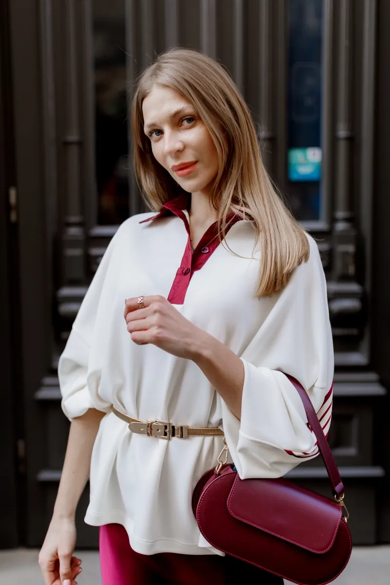 Модель виконана в молочному кольорі з ефектними акцентними смугами кольору бордо (бургунді) на рукавах та контрастною планкою на комірі.