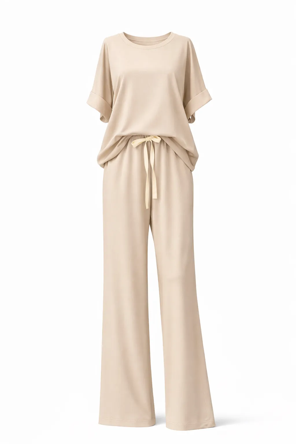 Комплект складається з вільної футболки з коротким рукавом та штанів прямого крою з еластичним поясом і контрастним шнурком.