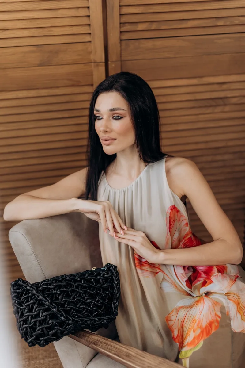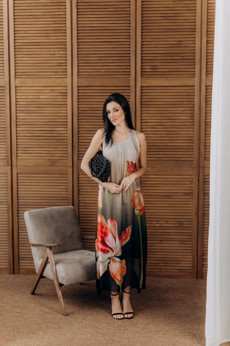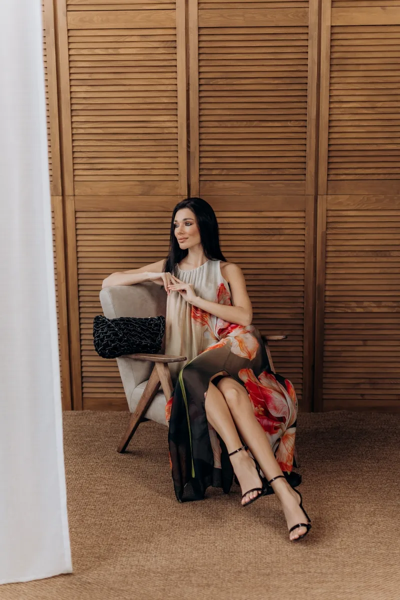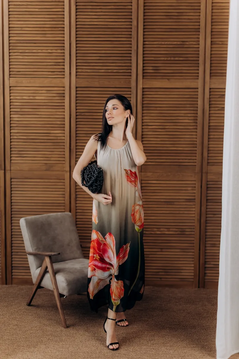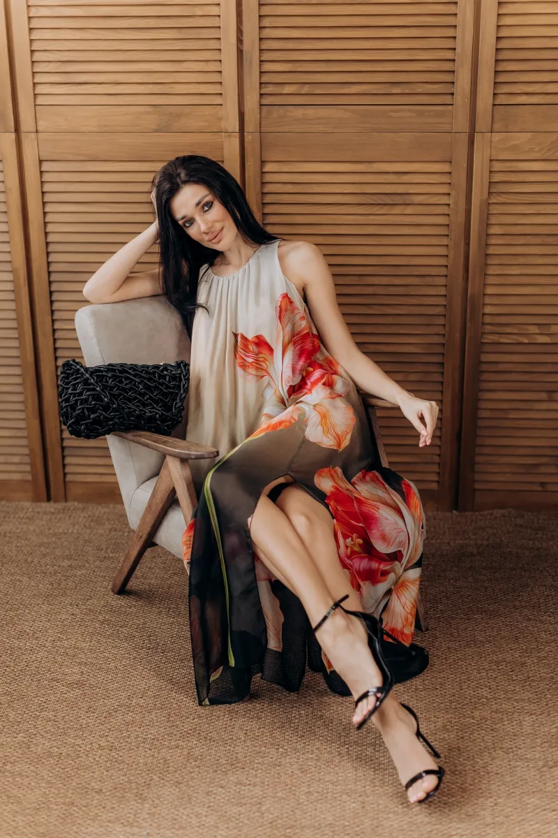 Ця шовкова сукня — як витвір мистецтва. Легка, струмлива тканина прикрашена яскравим маковим принтом, що створює неповторну гру кольору та світла.