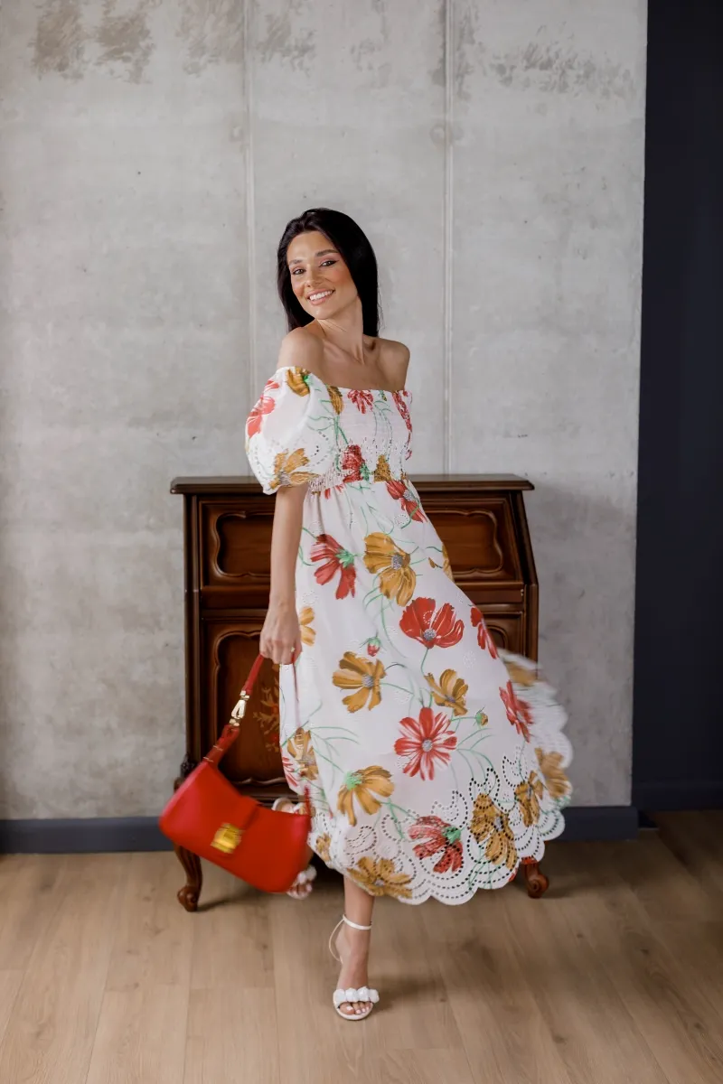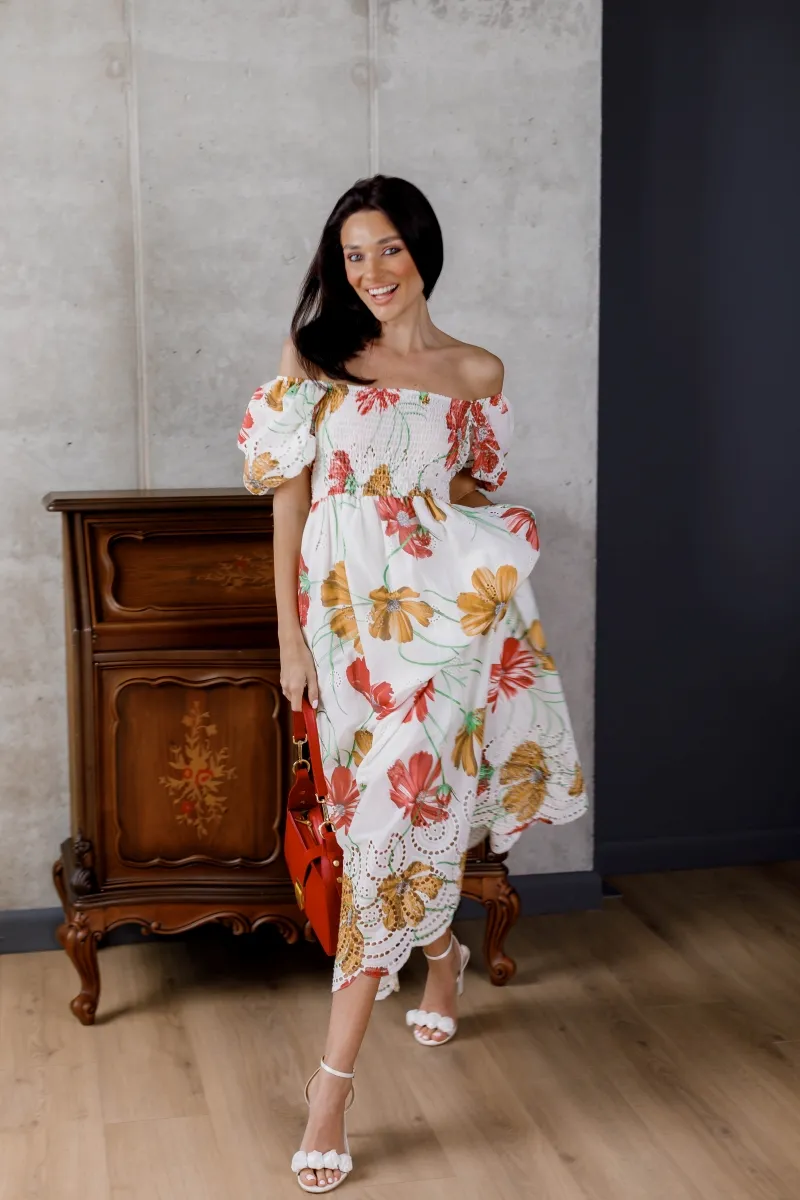 Романтична сукня від французького виробника — ідеальний вибір для теплої пори року. Модель із відкритими плечима, об’ємними рукавами та приталеним верхом створює жіночний та елегантний силует. Стримана довжина міді, легка тканина та яскравий квітковий принт додають образу свіжості й витонченості. Низ прикрашений вишуканою перфорацією, яка додає особливого шарму.