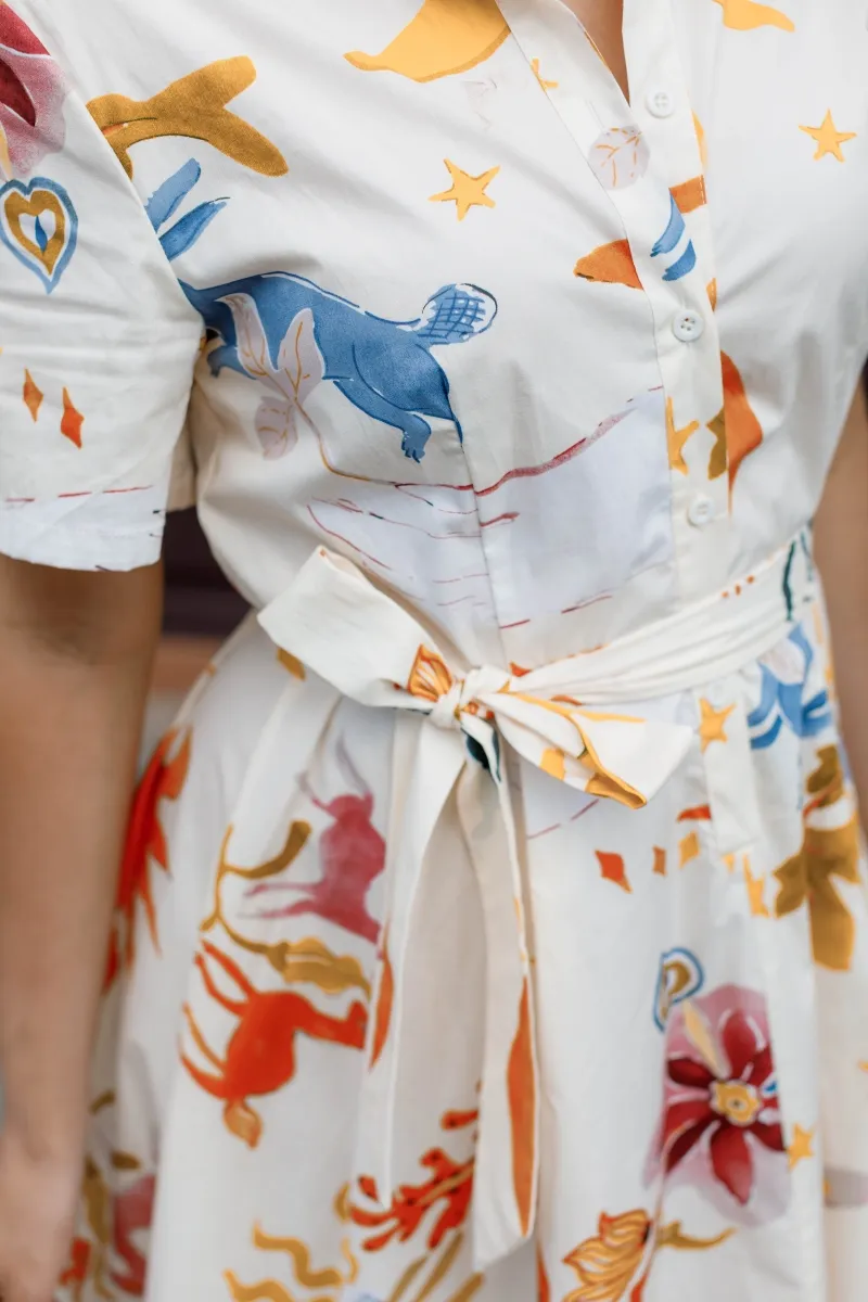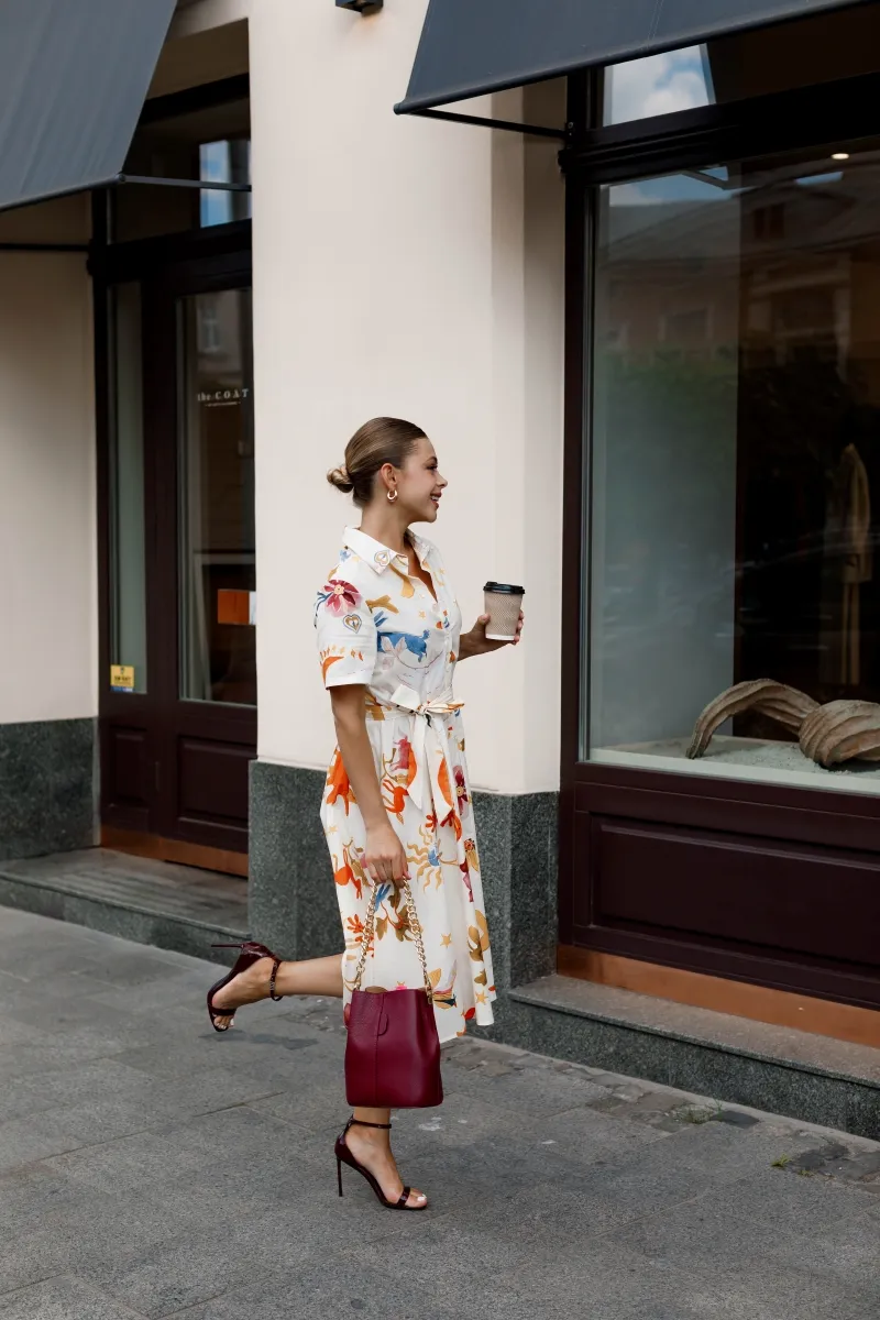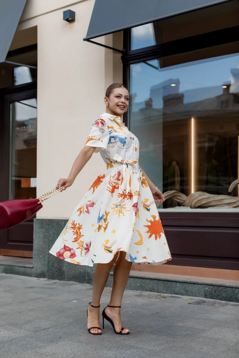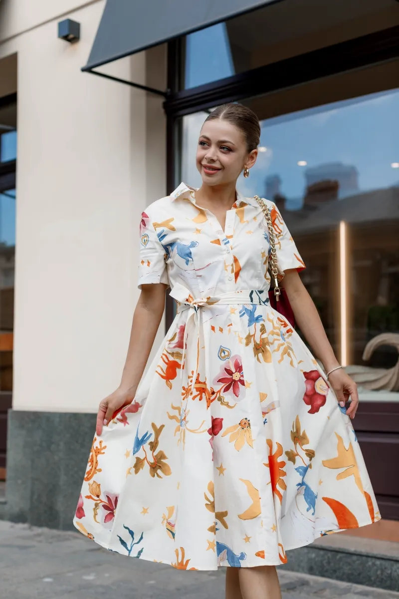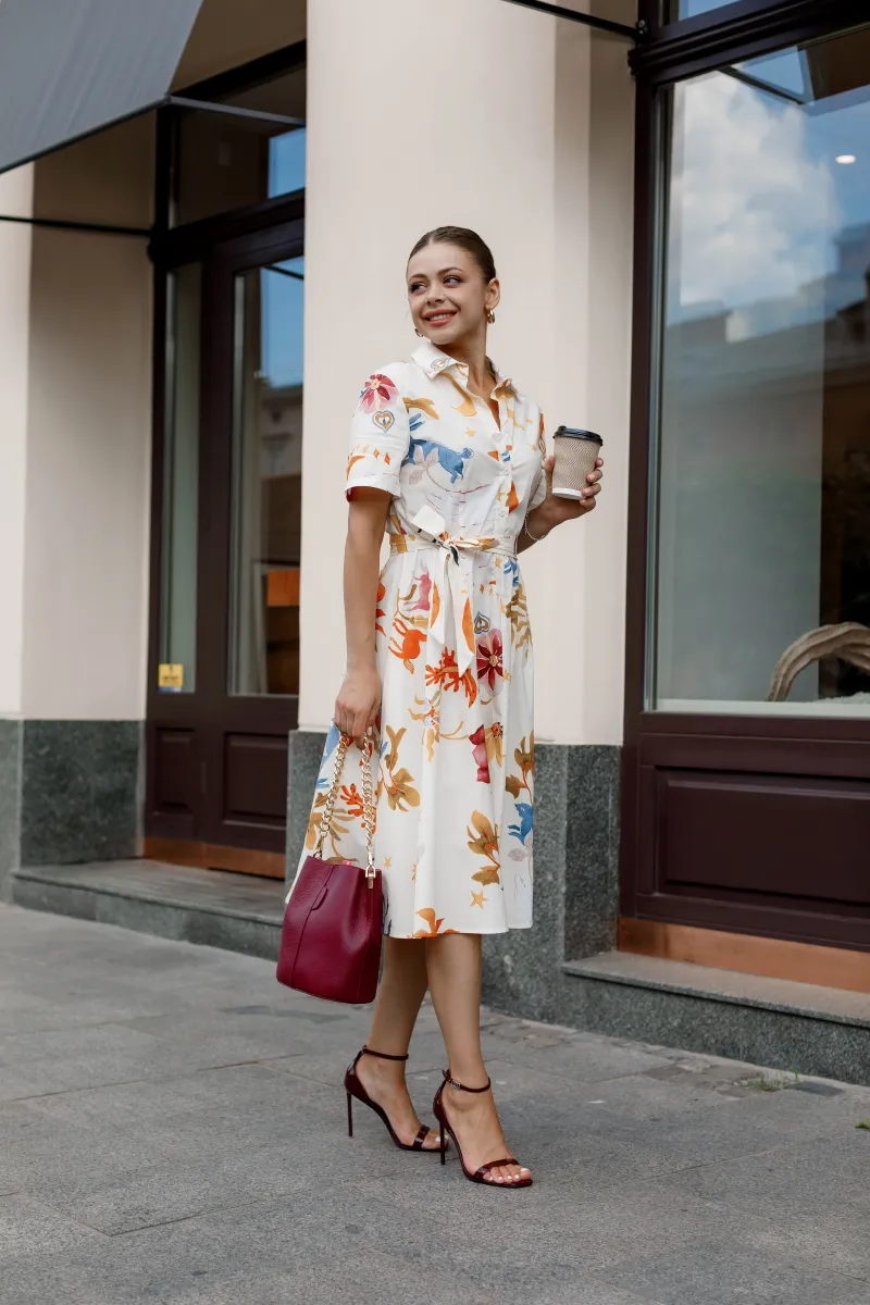 Модель в ніжному кремовому кольорі прикрашена яскравим флористичним принтом, який додає образу свіжості й витонченості. Актуальна довжина міді, короткий рукав і класичний комірець створюють силует, що пасує будь-якому типу фігури. Пояс у комплекті підкреслює талію та додає завершеності образу.