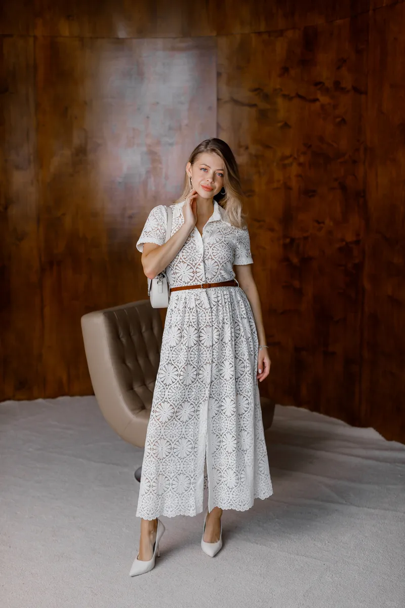 Плаття має класичний відкладний комір, короткі рукави та застібку на пуговиці по всій довжині – у стилі сорочкового крою.