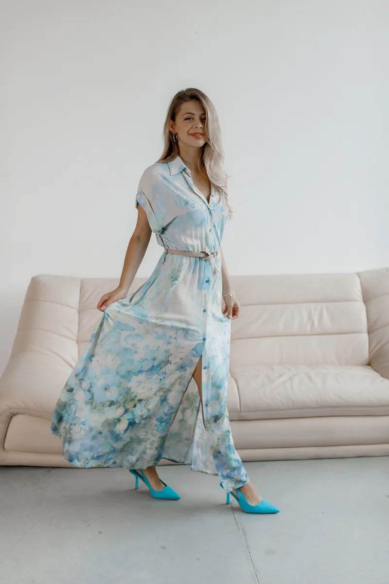 Пастельний акварельний принт у блакитно-зеленій гамі створює свіжий та витончений образ. Класичний сорочковий фасон з комірцем і застібкою на пуговиці робить це плаття максимально зручним та легким у стилізації.