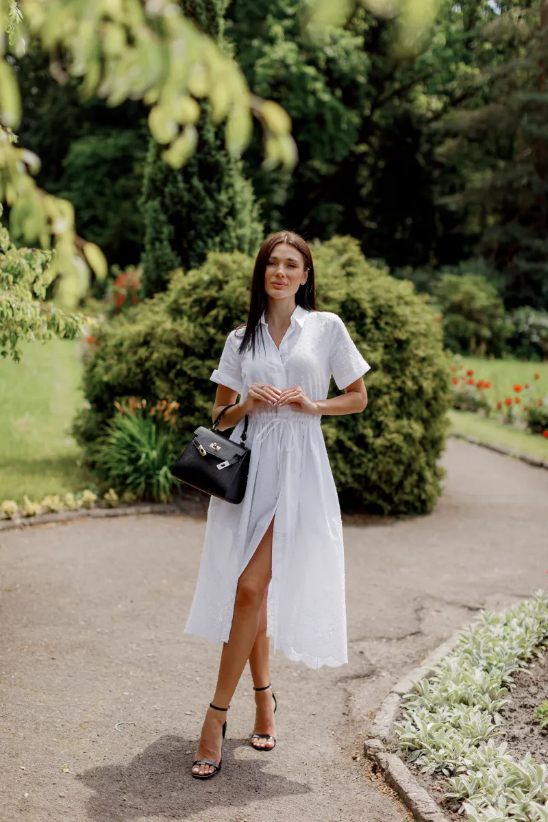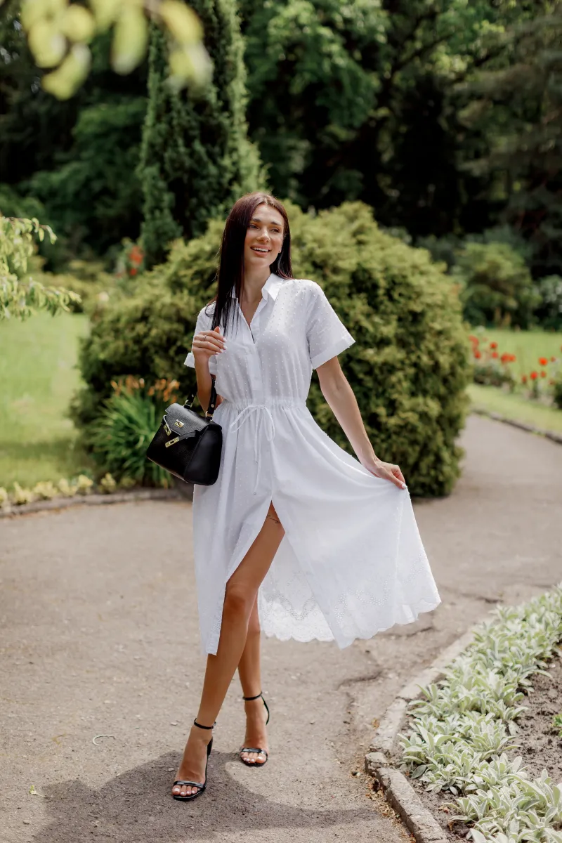 Сукня-сорочка довжини міді з класичним коміром, коротким рукавом і акцентом на талії завдяки кулісці зі шнурком.