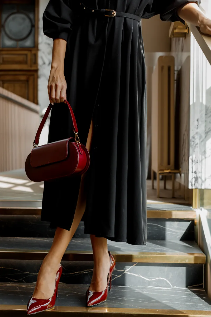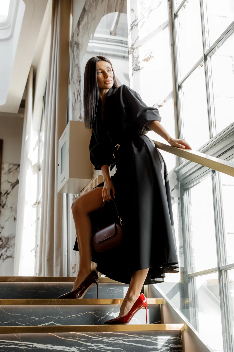 Лаконічна сукня-сорочка чорного кольору з класичним коміром, довгими рукавами та ґудзиками по всій довжині. Модель доповнена поясом, що підкреслює талію, та розкльошеним низом, який створює елегантний силует. Підходить як для щоденного носіння, так і для офісу.