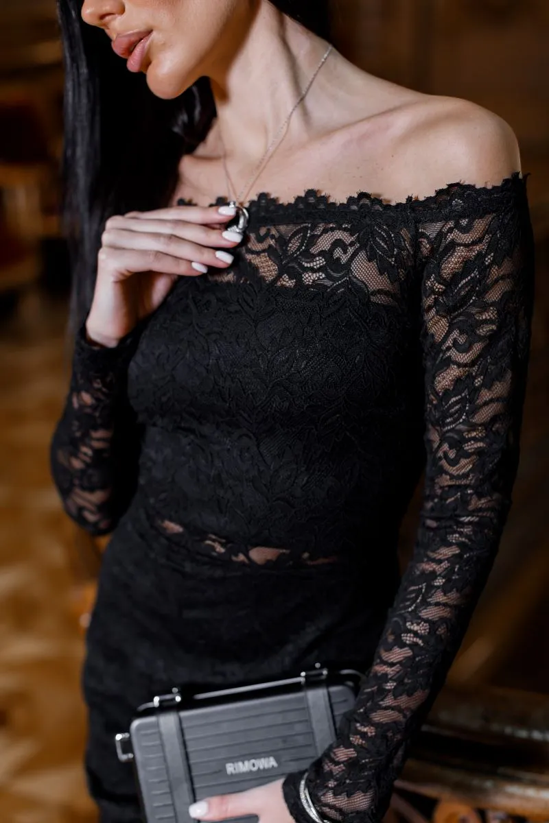 Сукня з мереживом чорна з відкритими плечима та довгим рукавом