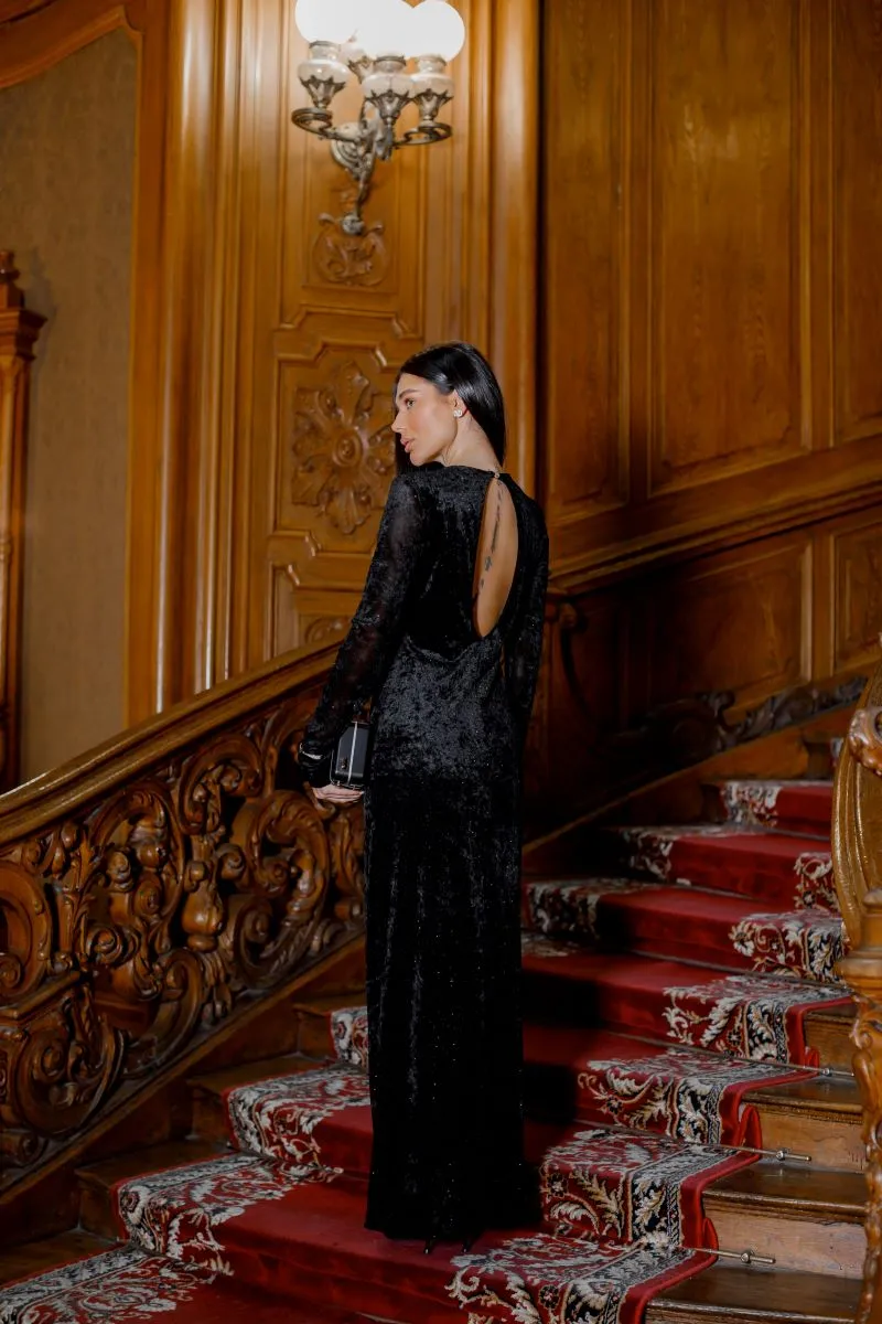Модель довжиною в підлогу має розкішний виріз на спині у формі краплі, який елегантно застібається ґудзиком на шиї.