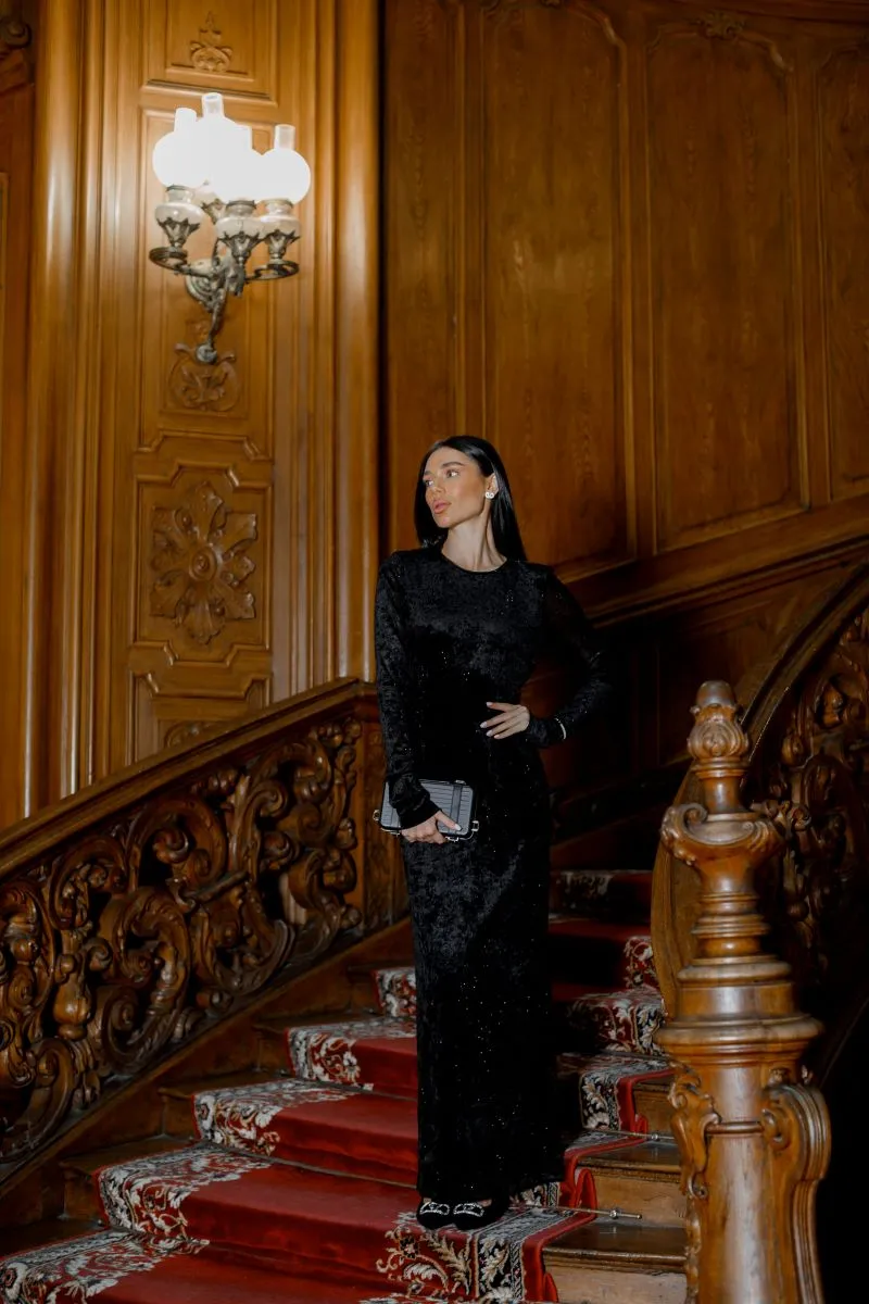 Прозорі рукави додають легкості та загадковості образу, а вишуканий блиск тканини ніжно вловлює світло, створюючи ефект "дорогої простоти".