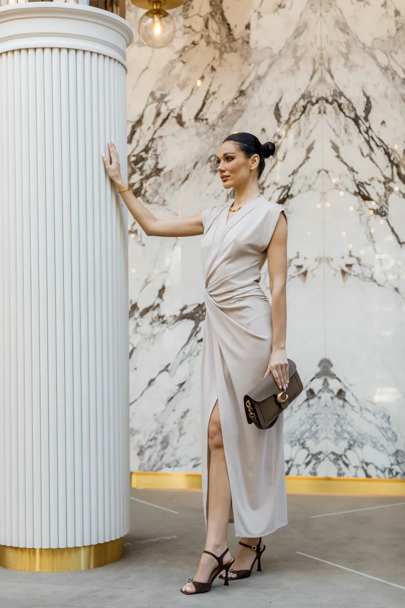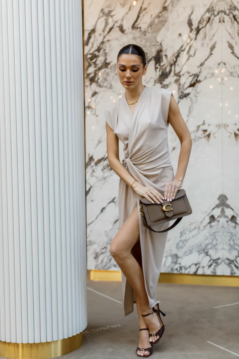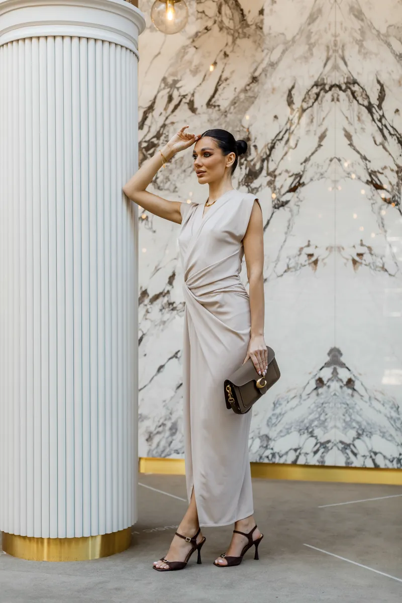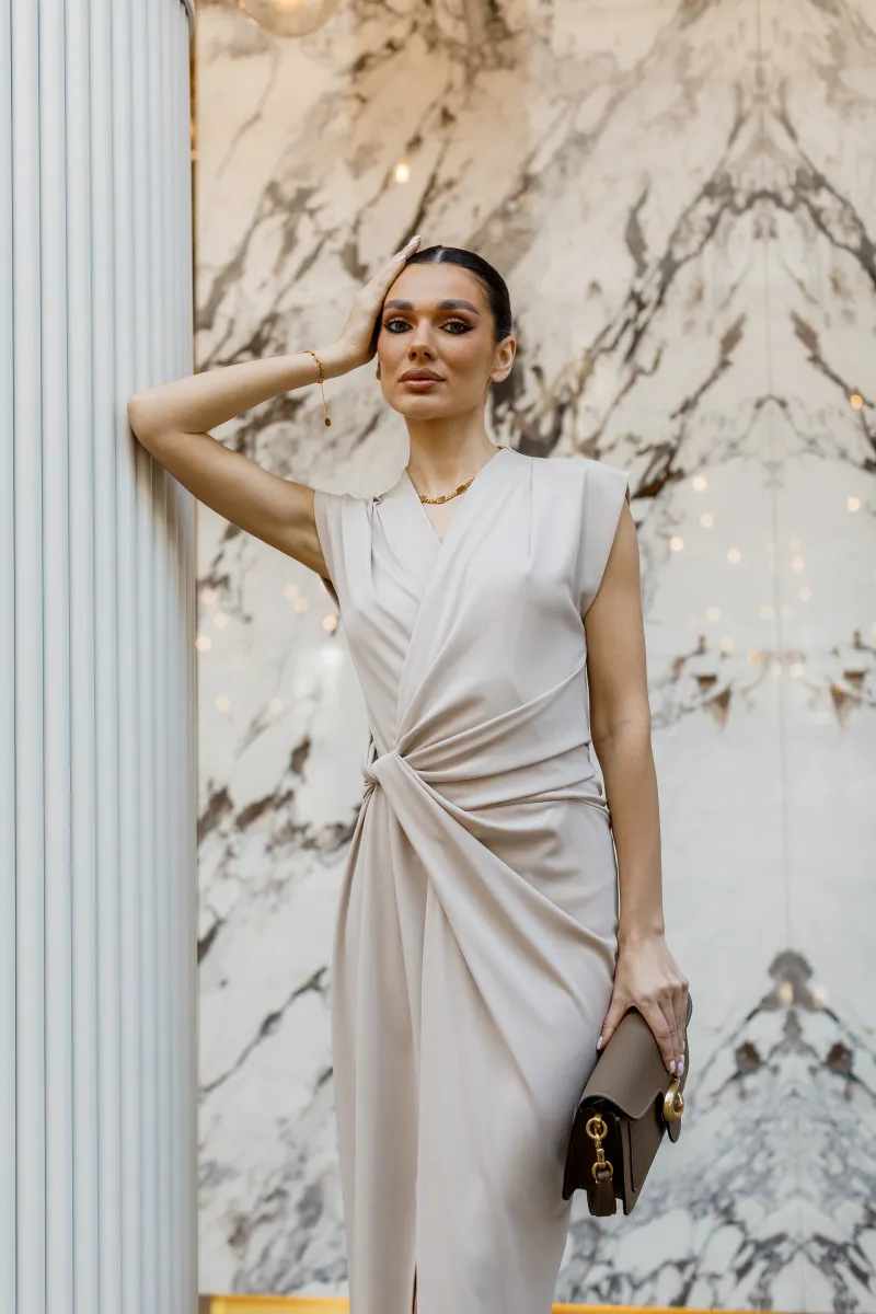 Елегантна сукня міді у витонченому бежевому відтінку, яка підкреслює жіночність та витонченість силуету