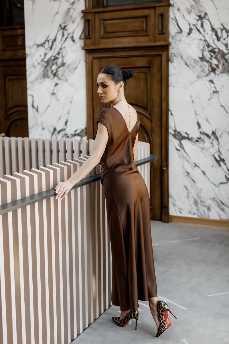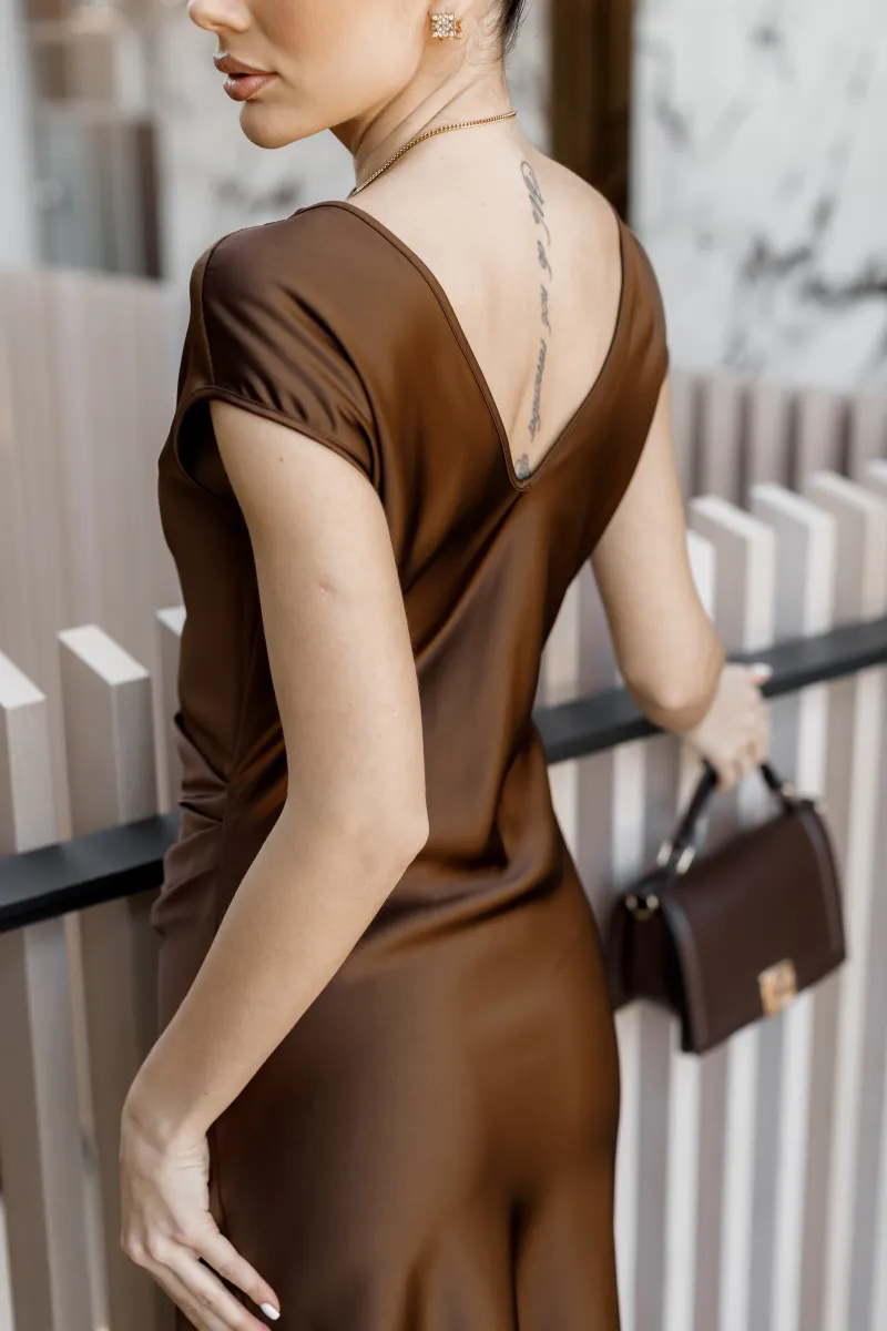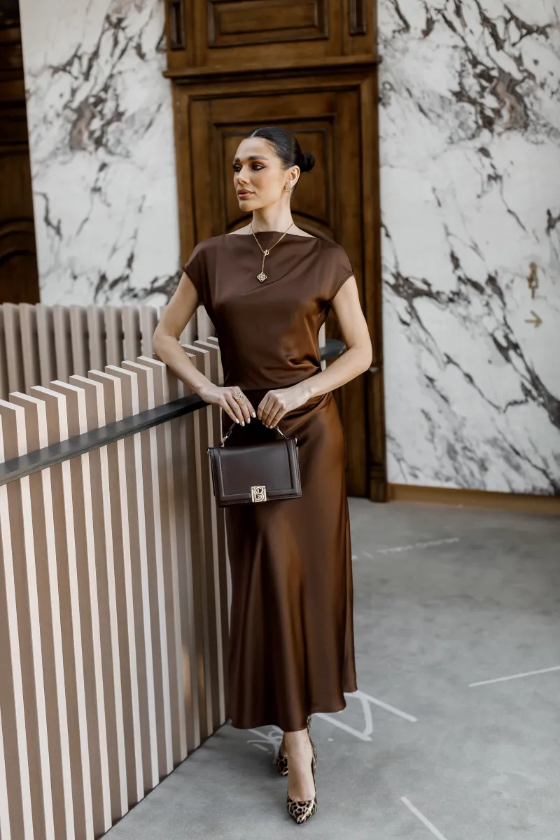 Елегантна сатинова сукня міді у глибокому шоколадному відтінку — ідеальний вибір для створення витонченого та жіночного образу