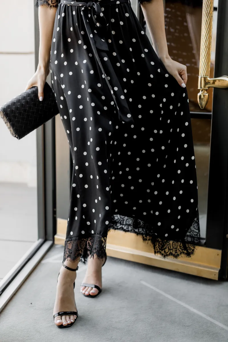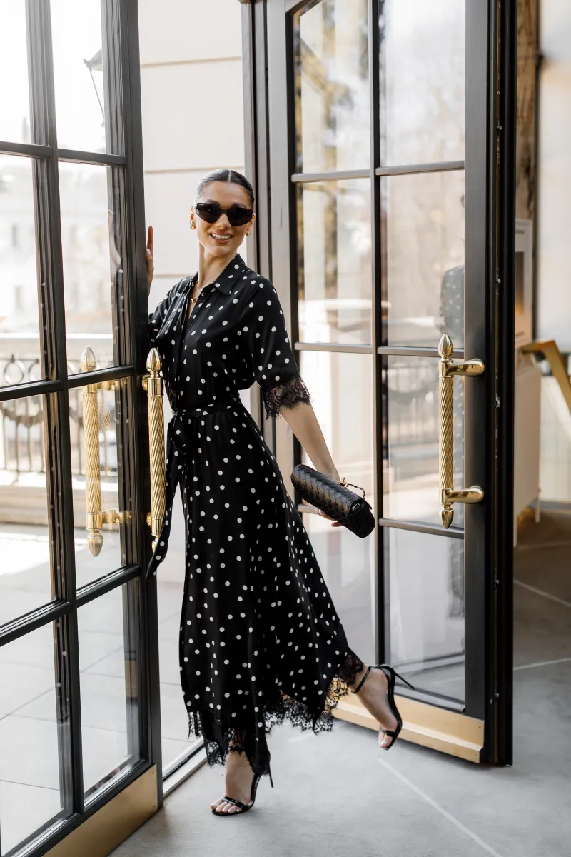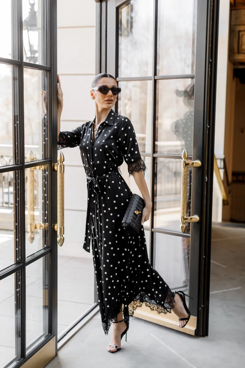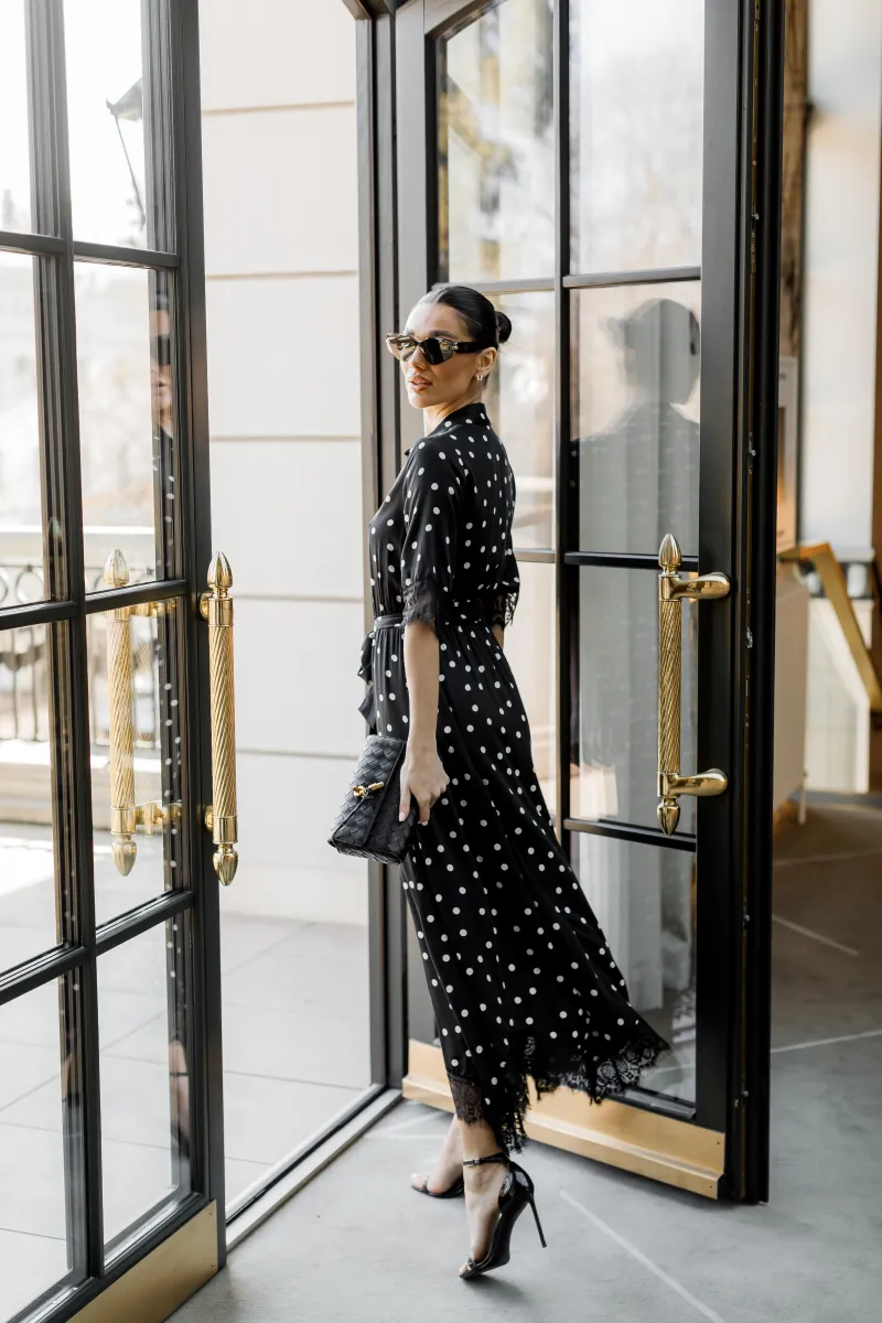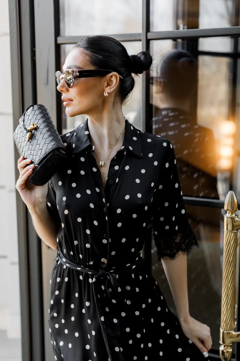 Елегантна сукня міді у чорному кольорі з класичним принтом у горох створює витончений та жіночний образ