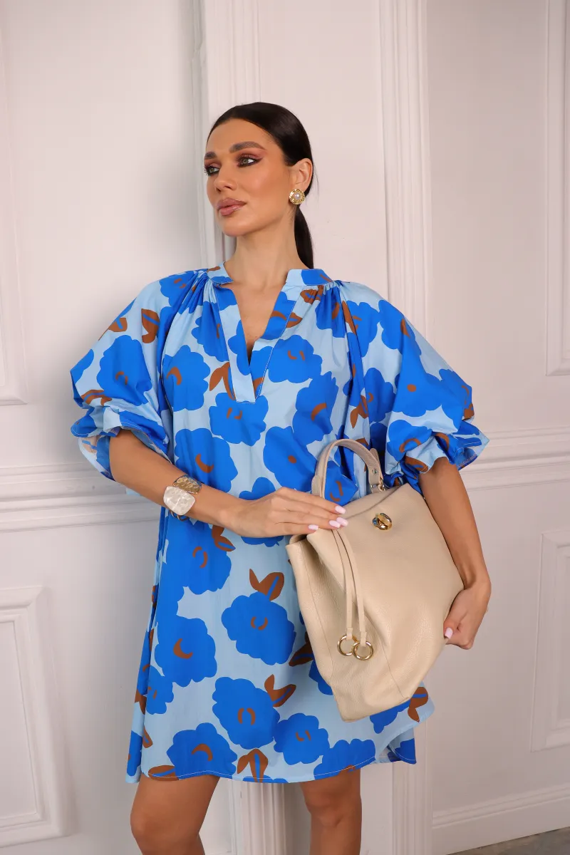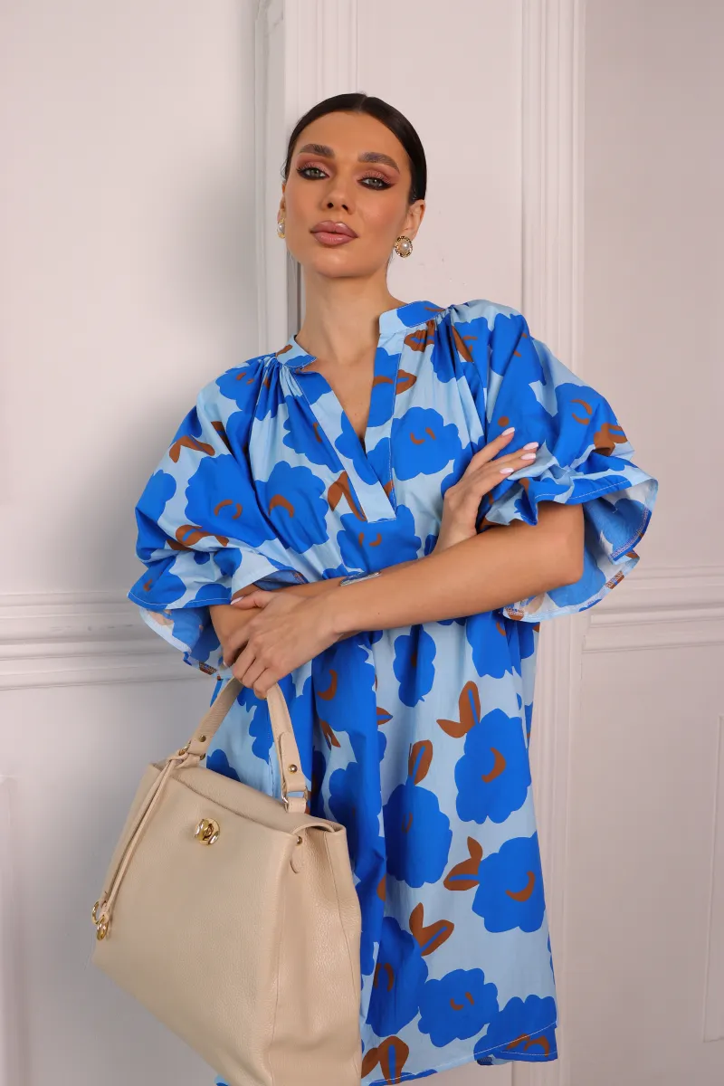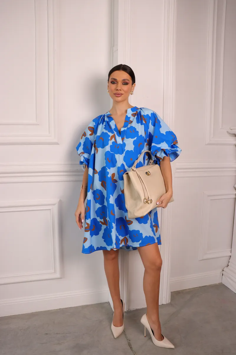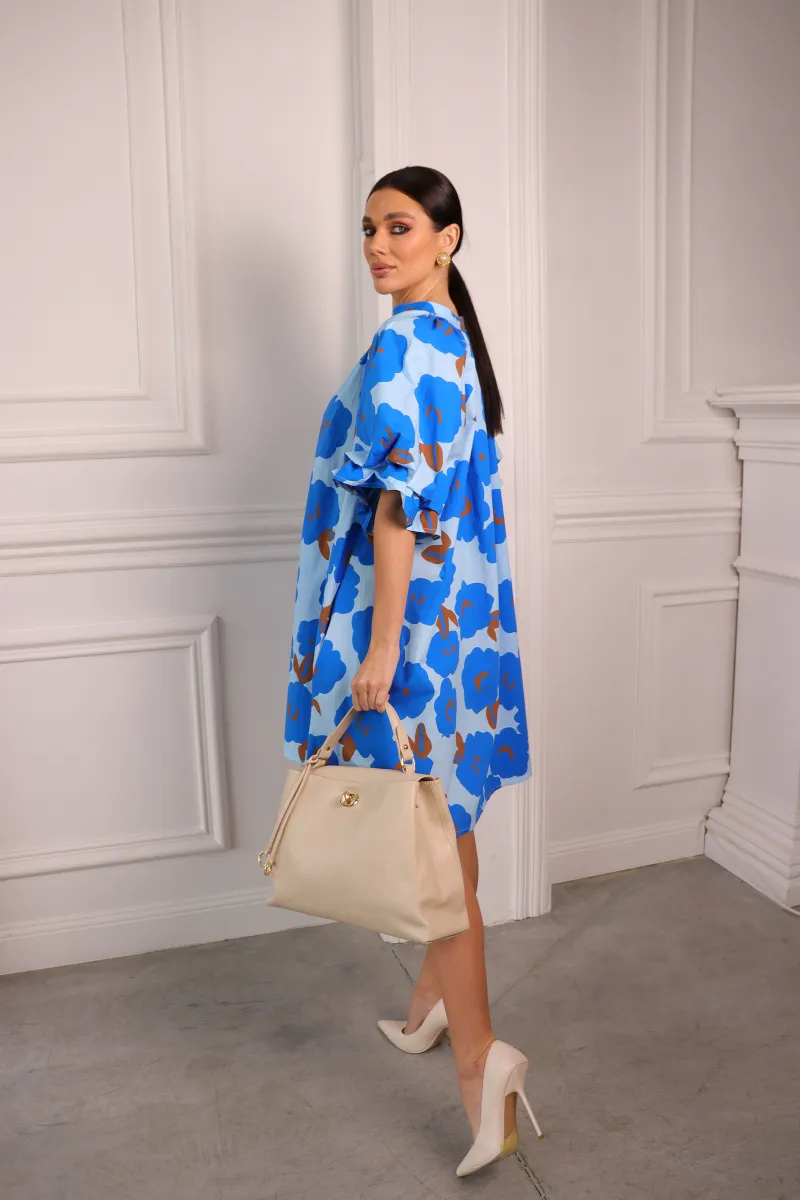 Стильна сукня міні у вільному oversize крої з яскравим блакитним принтом — ідеальний варіант для сучасних та комфортних образів.