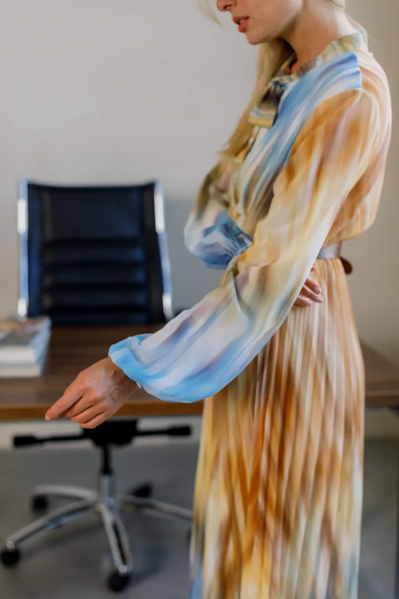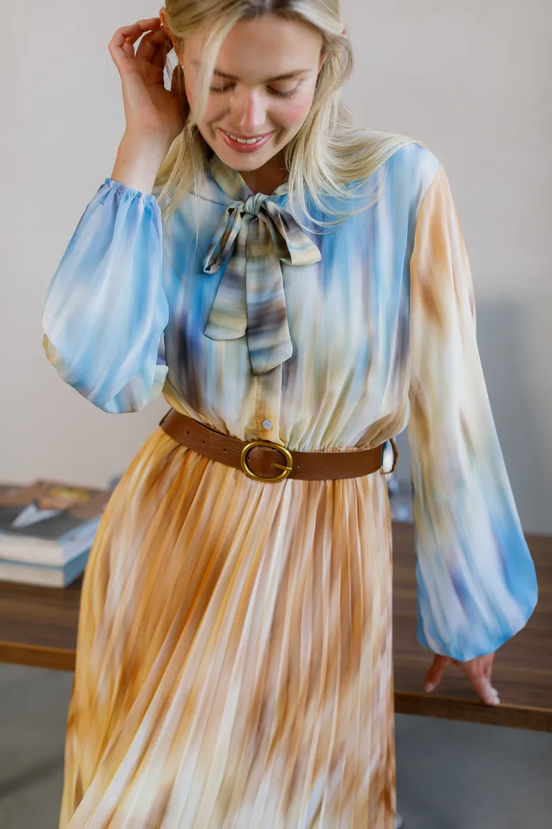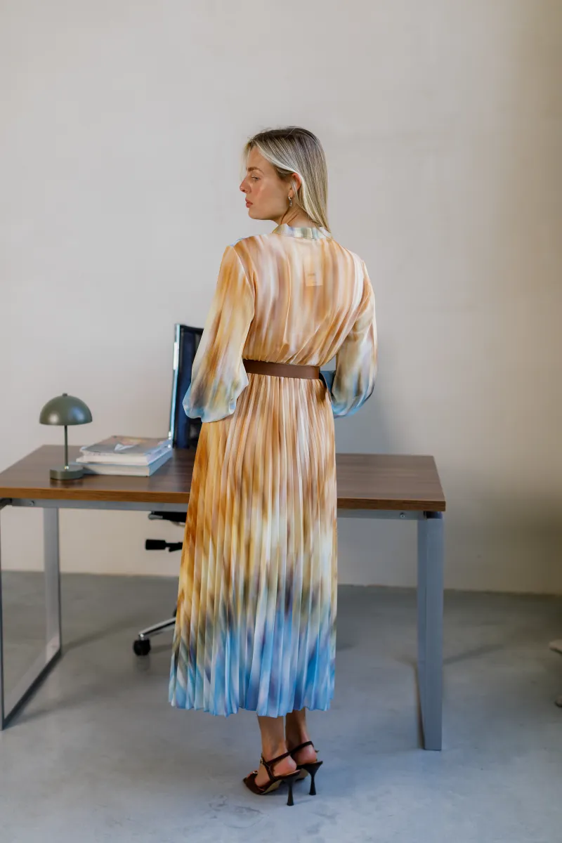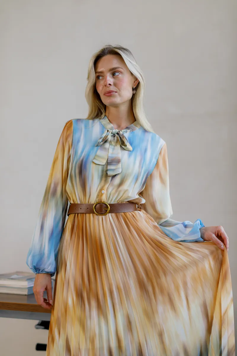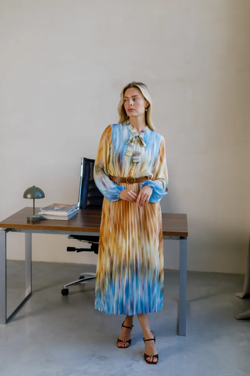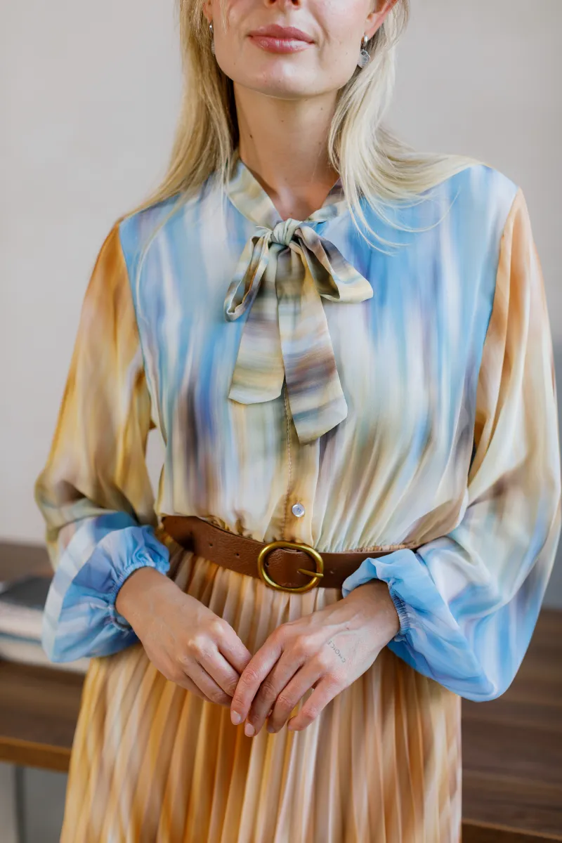 Елегантна сукня міді довжини з легким плісуванням і ніжним акварельним принтом. Верх із коміром-стійкою доповнений декоративним бантом, що додає вишуканості, а м’які відтінки синього, карамельного та кремового створюють ефектну гру кольору.
