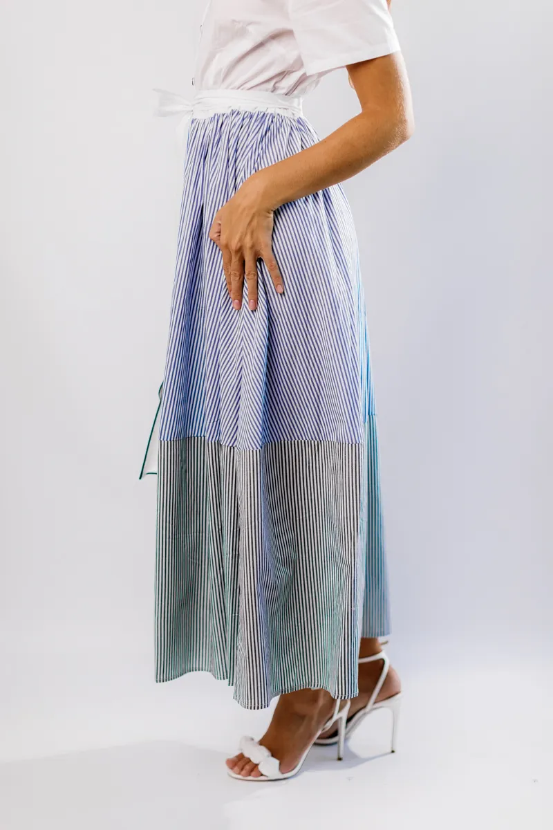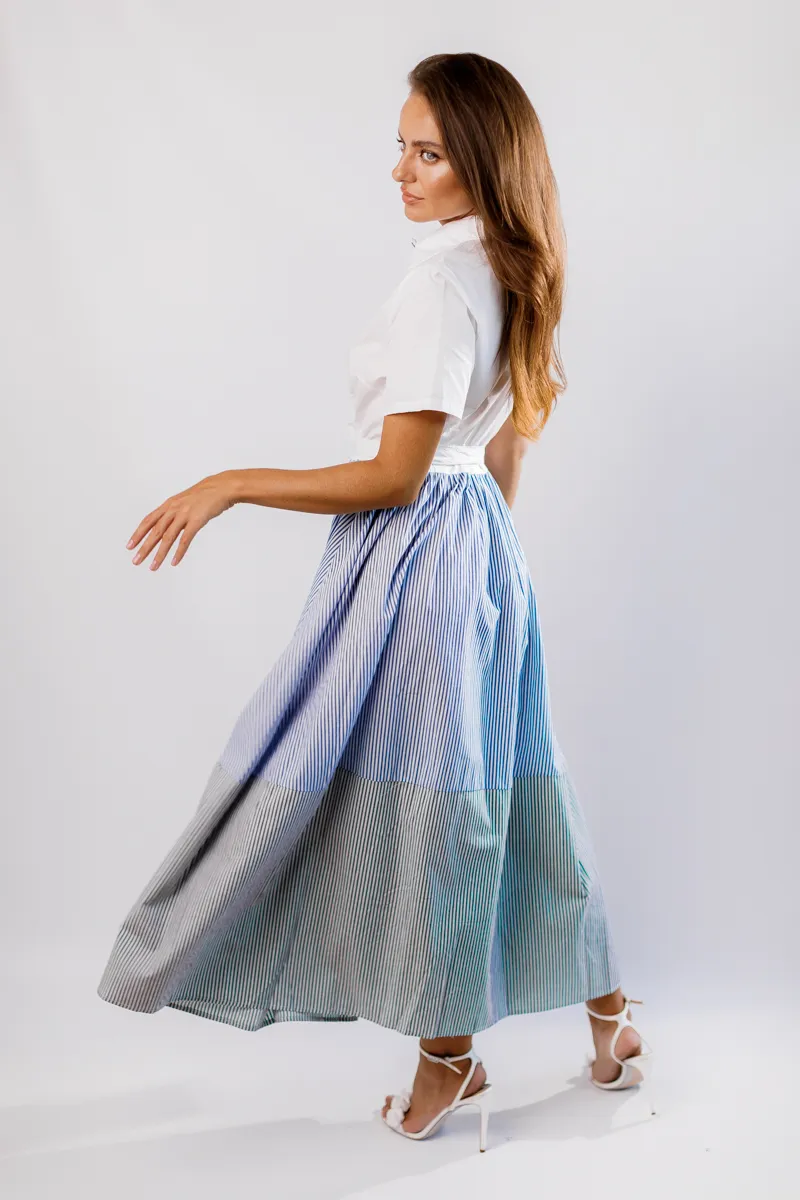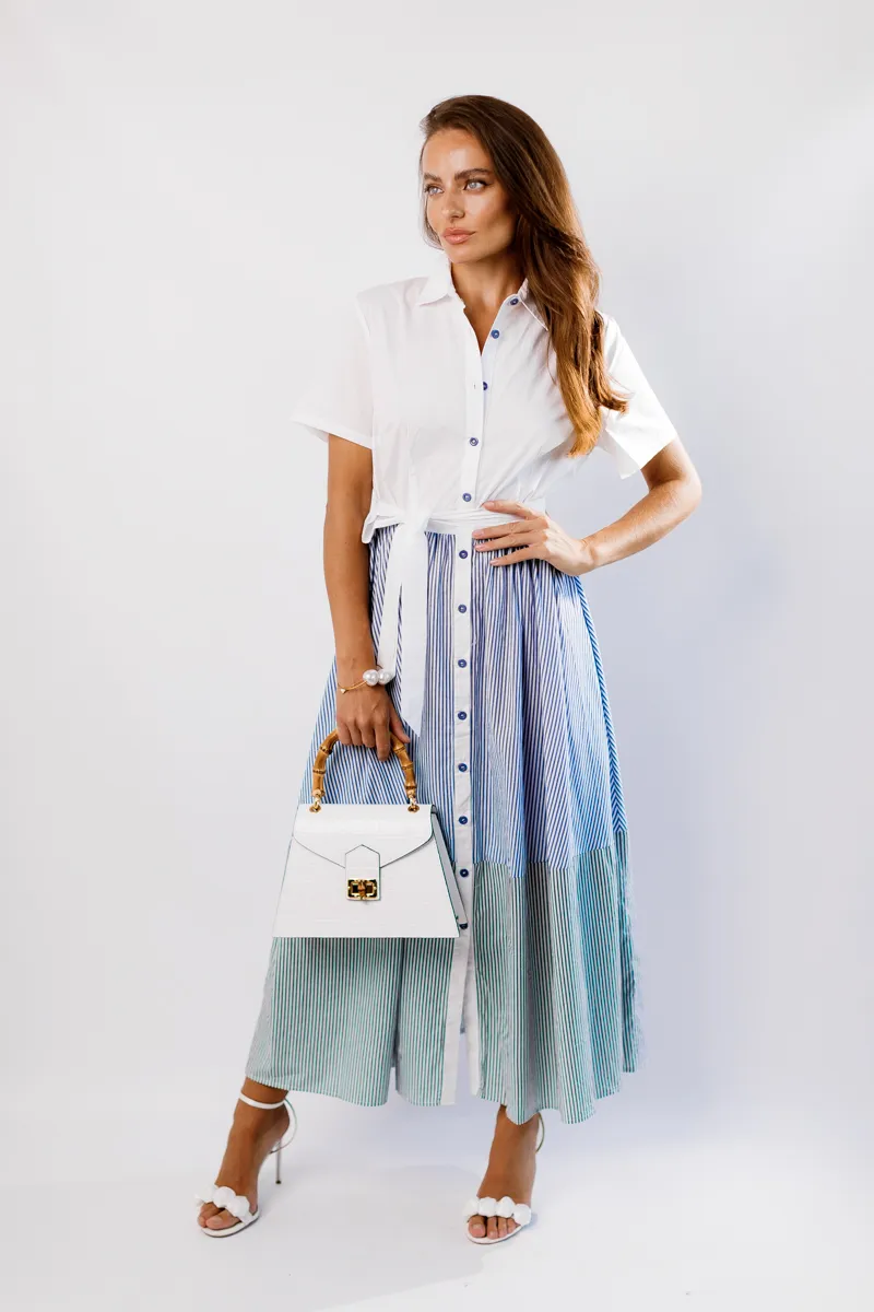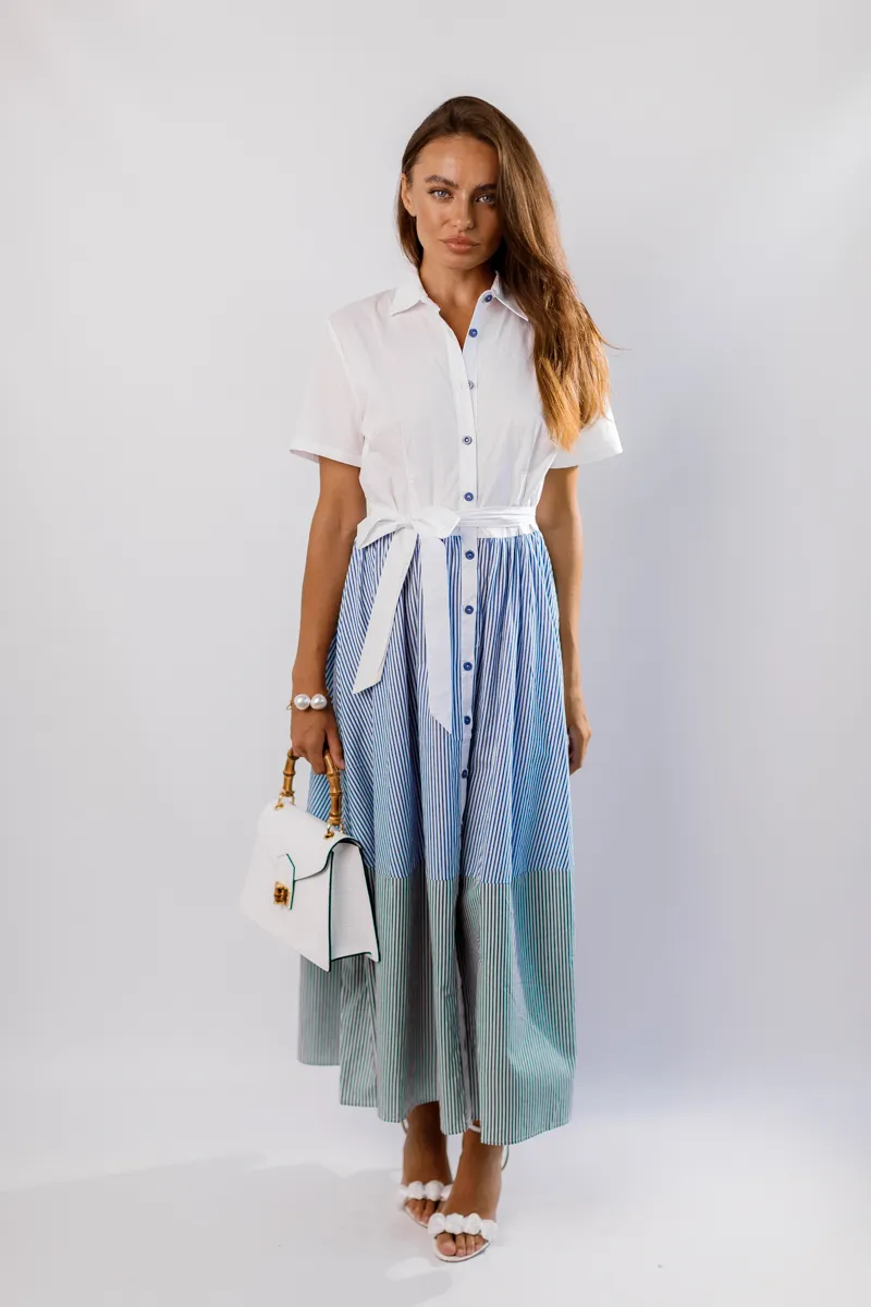 Ця елегантна та стильна сукня максі від французького виробника виготовлена з 100% натуральної бавовни, що забезпечує максимальний комфорт та дихаючі властивості. Комірець на гудзиках додає класичний вигляд, а пояс на талії підкреслює фігуру, створюючи витончений силует. Доступна в трьох розкішних кольорах – білому, синьому та чорному – з актуальним принтом "сміжка", ця сукня є універсальним вибором для будь-яких подій, додаючи вашому образу елегантності та жіночності.