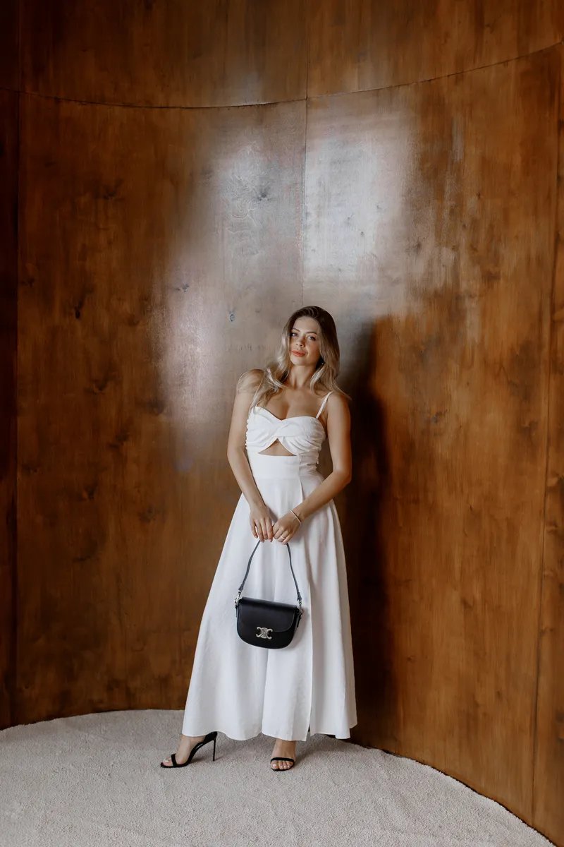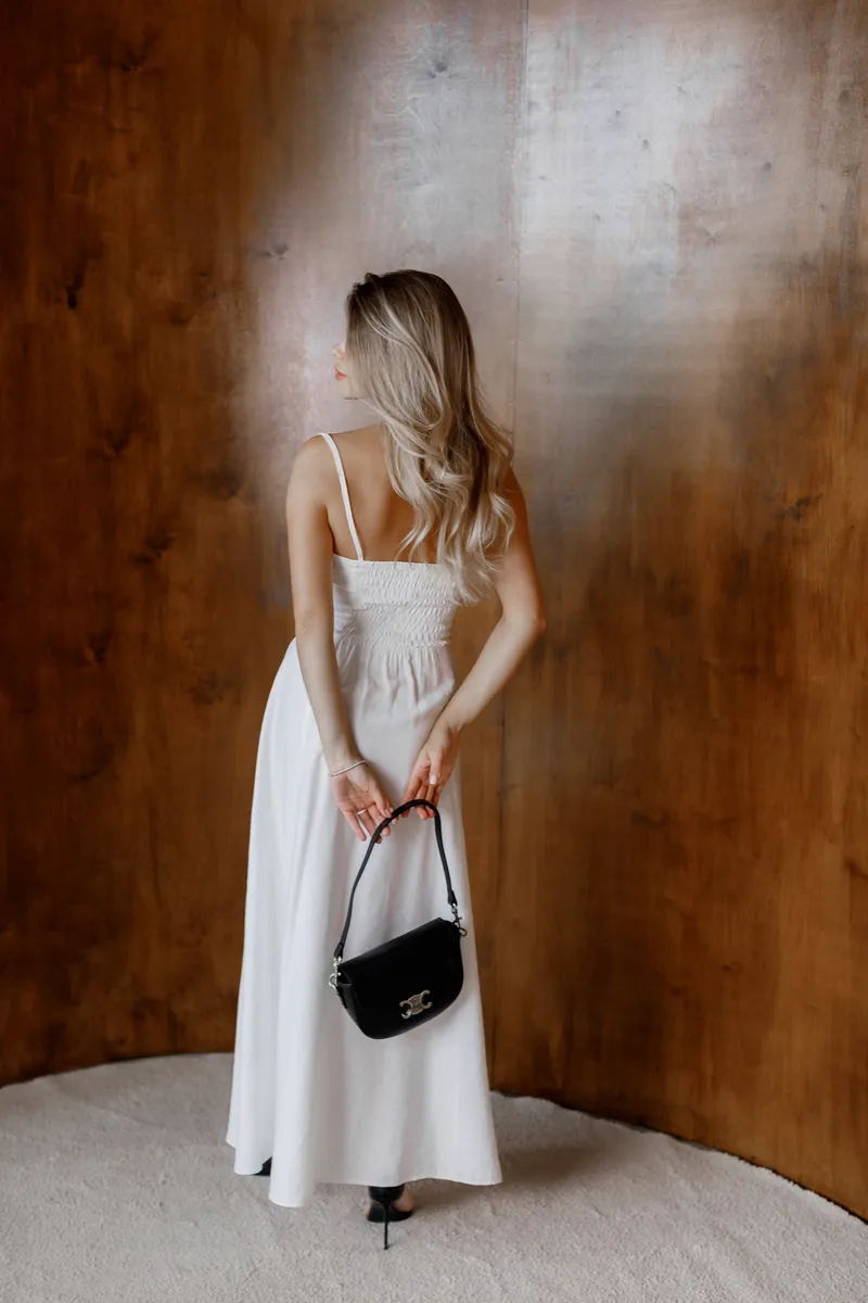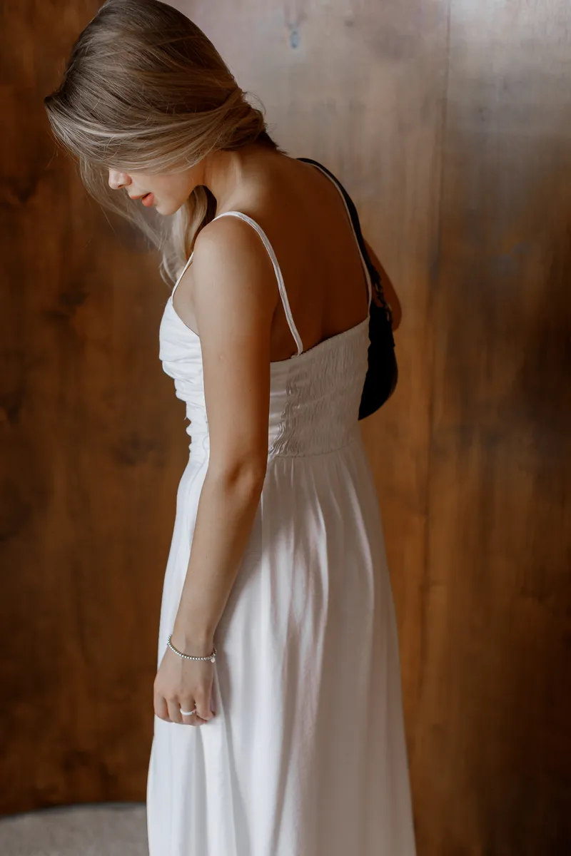 Легкість, жіночність та спокусливий крій — ця сукня створена для особливих літніх моментів. Модель у довжині максі виконана з м’якої, приємної до тіла тканини світлого відтінку. Завдяки легкому розкльошеному низу та лаконічному ліфу з драпуванням і вирізом під грудьми вона виглядає елегантно та водночас зухвало.