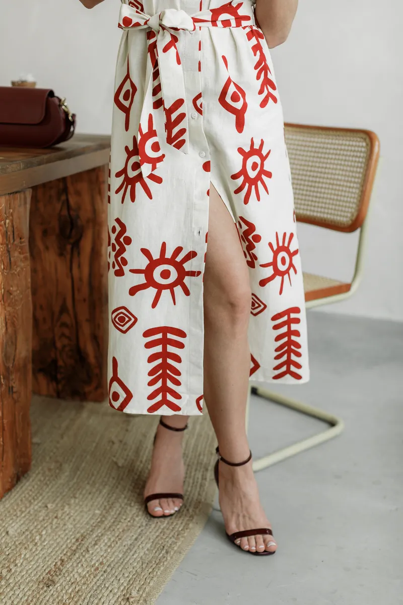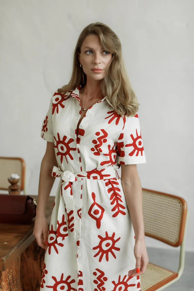 Особливий акцент — яскравий червоний арт-принт, що надає характеру шкірного образу. Класична довжина міді, зручні короткі рукави та планка на ґудзиках роблять це плаття ідеальним для міських прогулянок та подорожей.