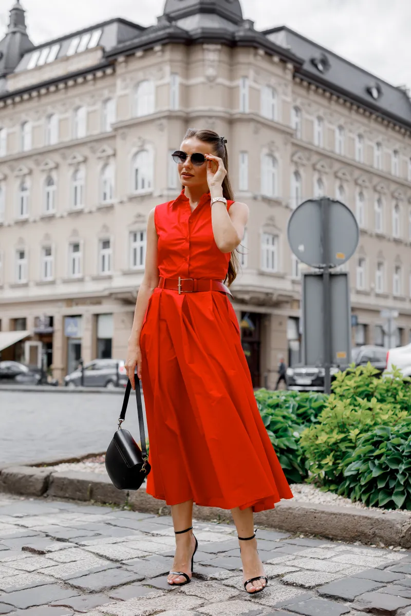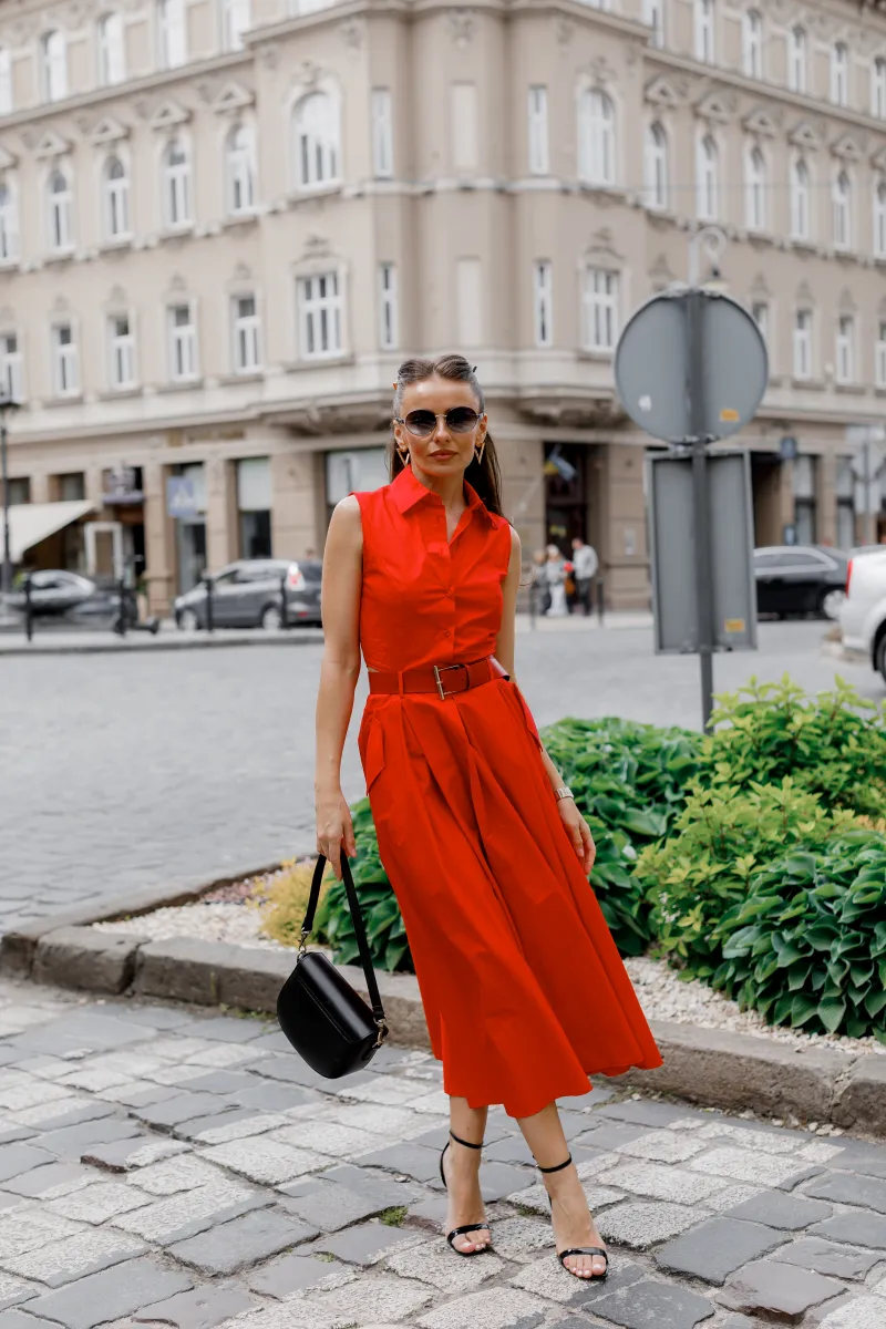 Сукня з натуральної бавовни — елегантне рішення для літнього гардеробу. Модель підкреслює талію завдяки поясу, має витончену довжину міді, зручні кишені та застібку на ґудзики. Яскравий червоний колір додасть впевненості й стилю Вашому образу. Ідеальна для міських прогулянок, подорожей або ділових зустрічей у спеку.