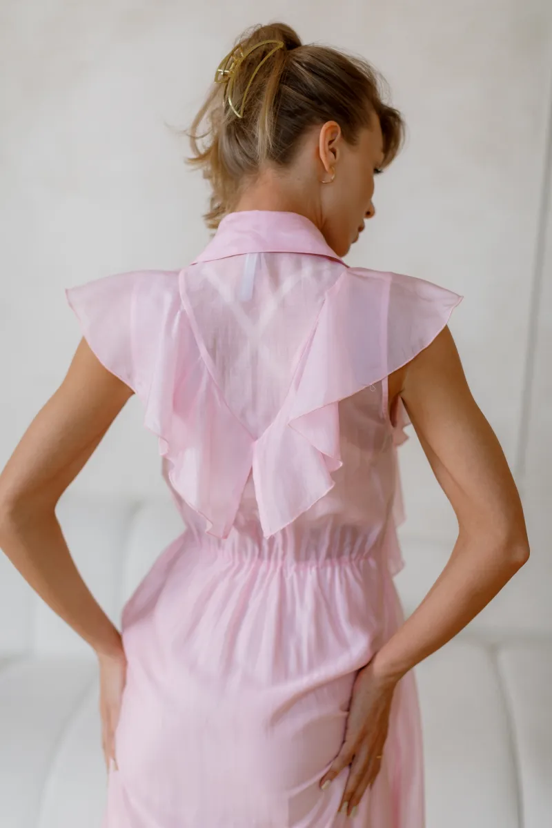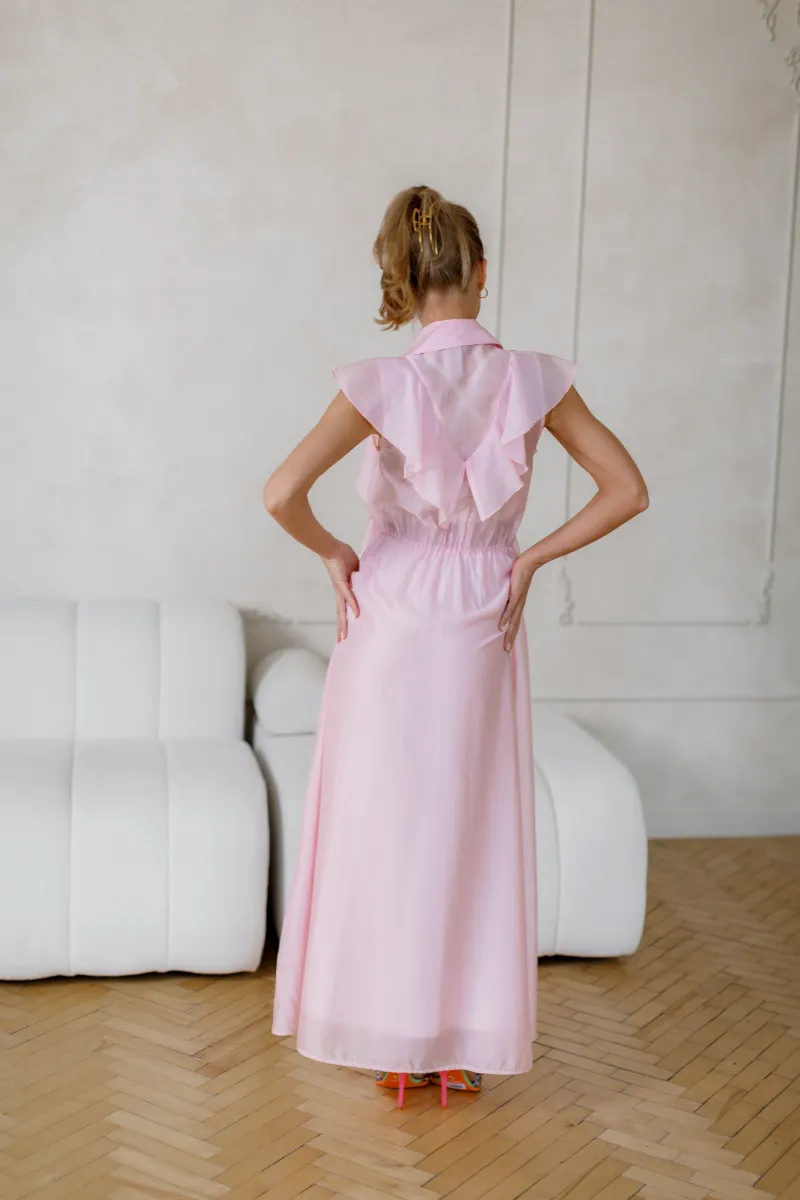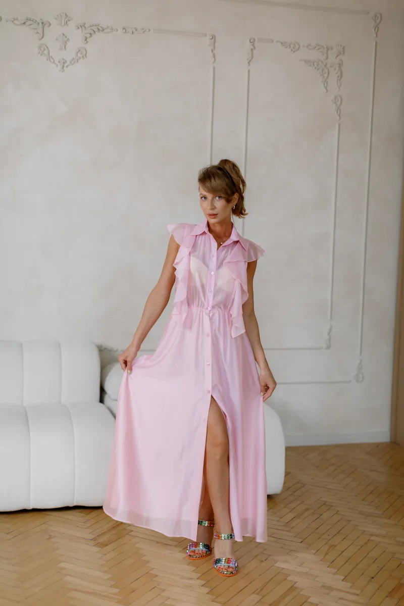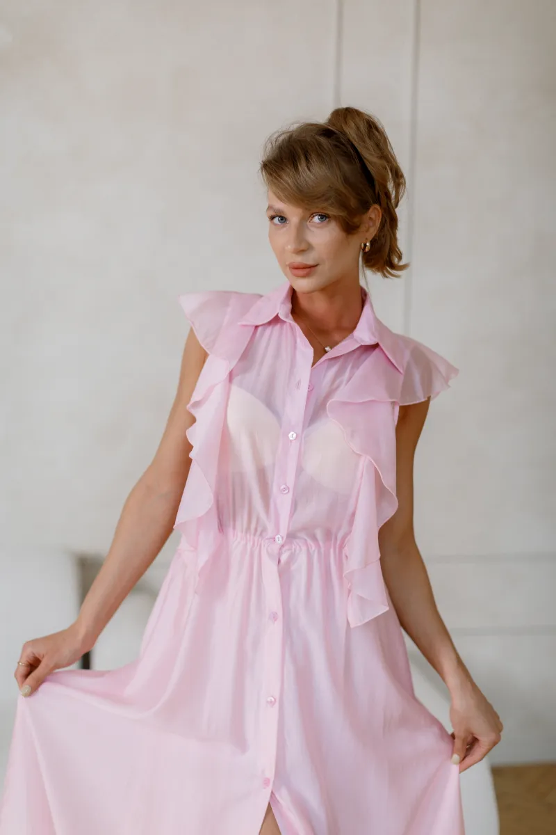 Довга рожева сукня-сорочка без рукавів із легкого бавовняного матеріалу та декоративними воланами