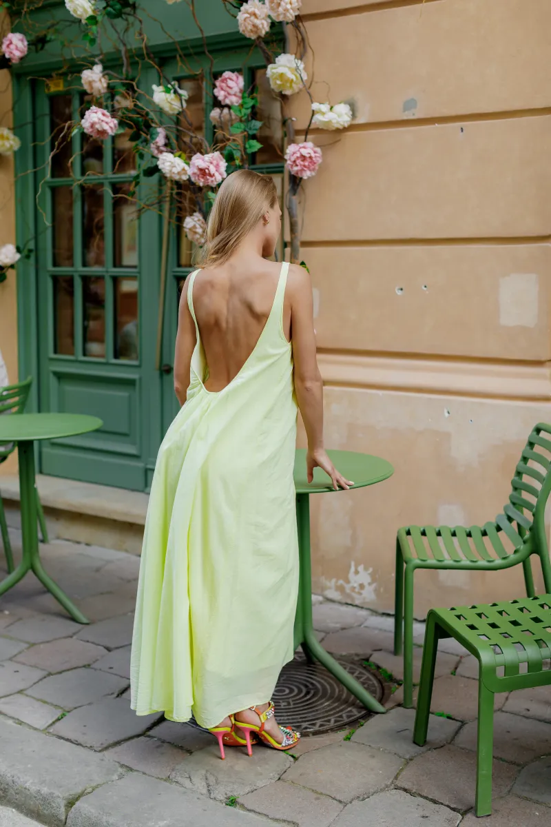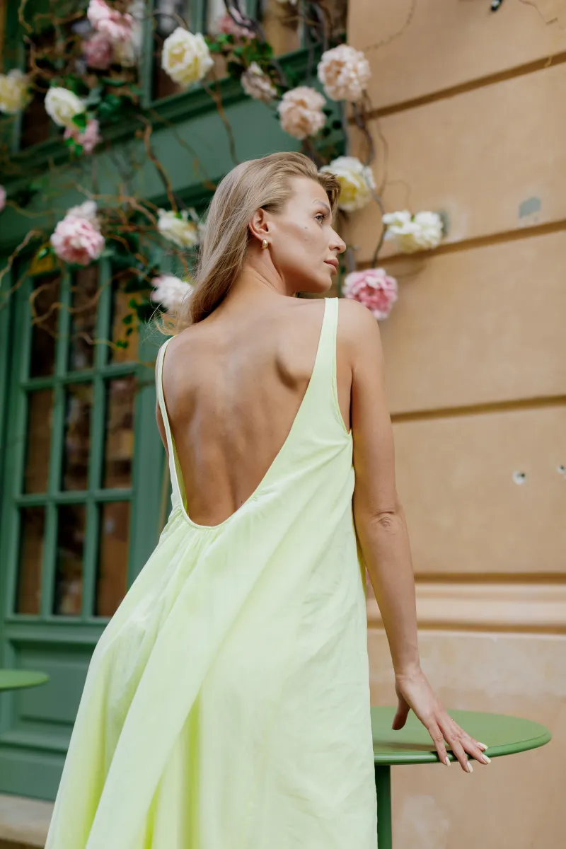 Ця сукня у ніжному лимонному відтінку — втілення літньої свіжості й легкості. Вільний фасон у поєднанні з глибоким вирізом на спині створює ефект невимушеної елегантності.