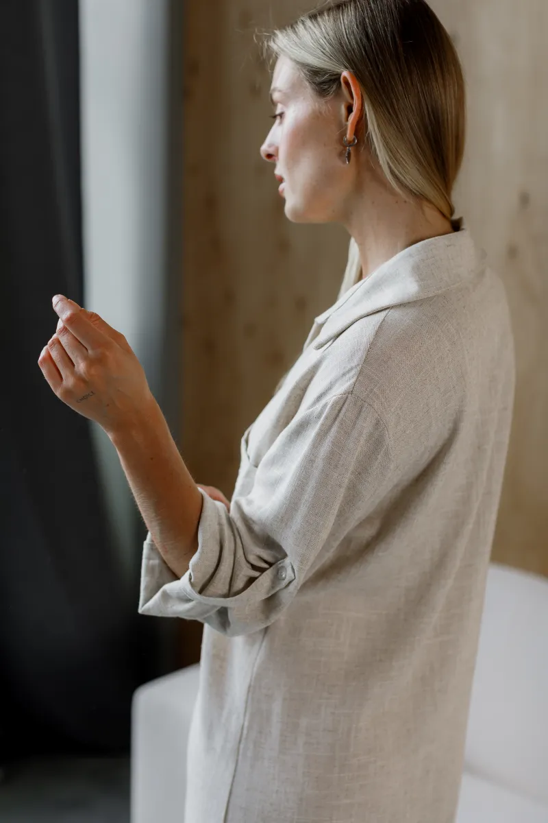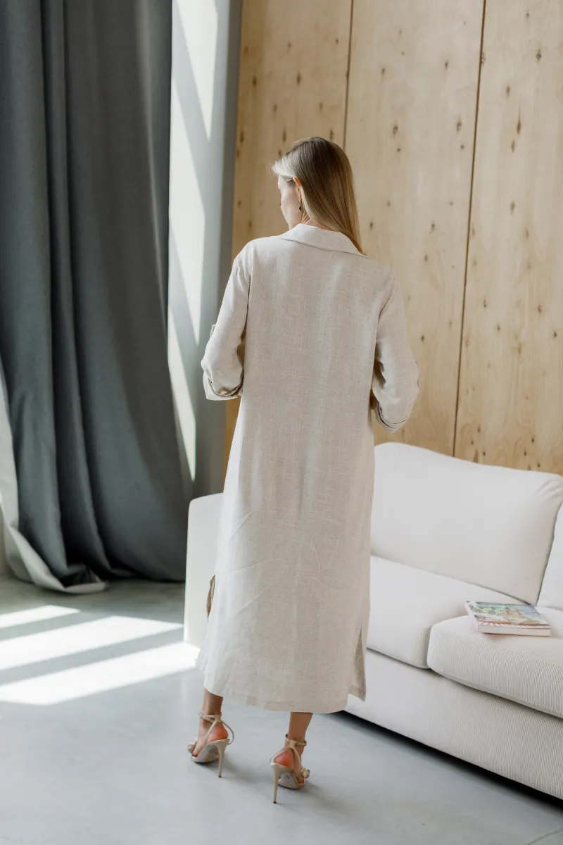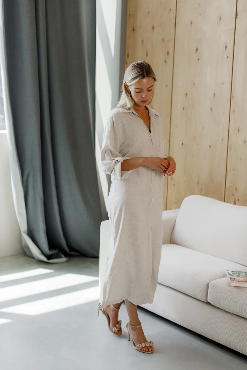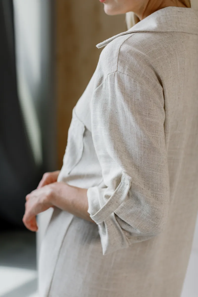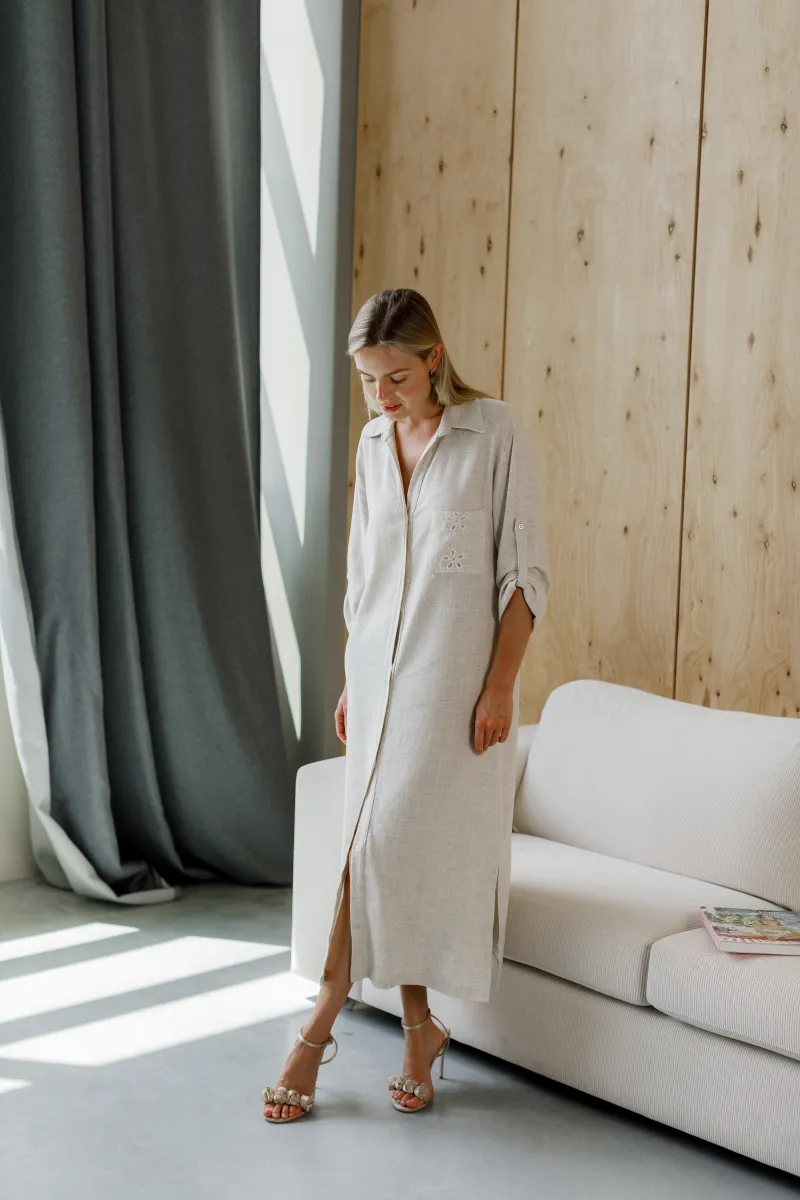 Лаконічна та витончена сукня прямого крою з акцентом на текстурі тканини та вишитою деталлю на нагрудній кишені. Зручні застібки на ґудзиках по всій довжині та можливість підкочування рукавів роблять її практичною для щоденного носіння.