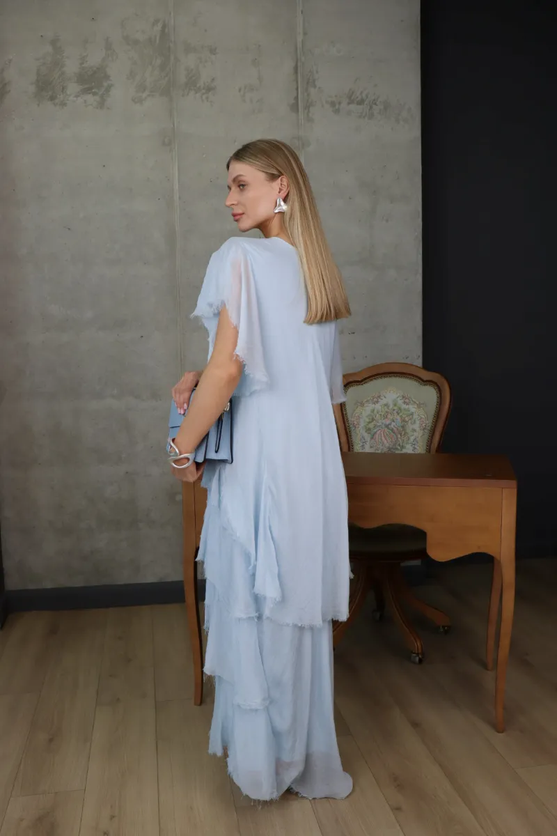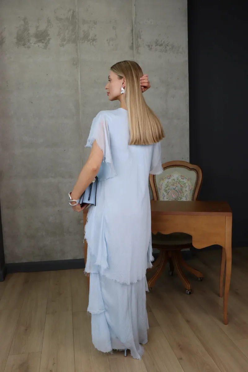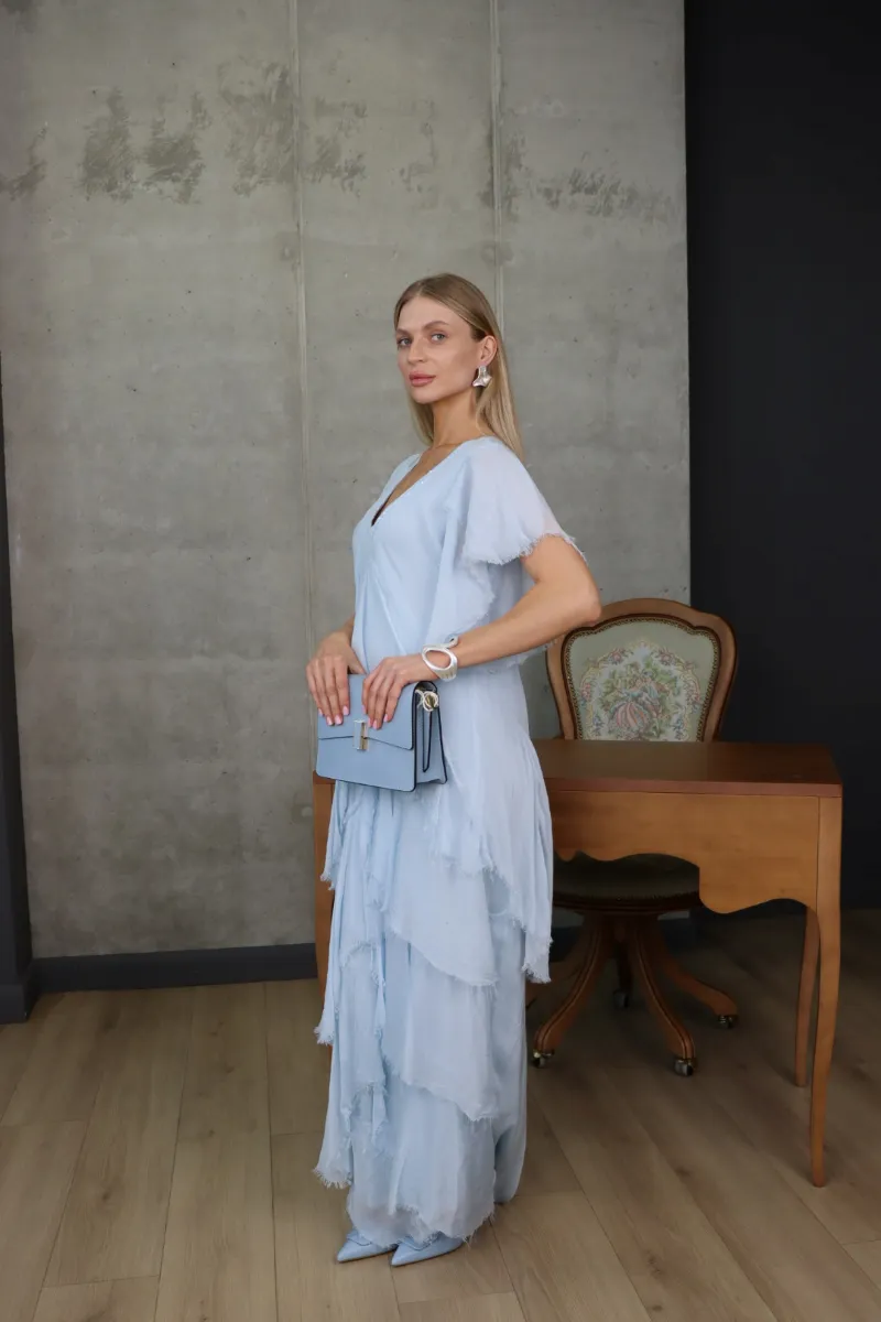 Ніжна шовкова сукня у блакитному відтінку — втілення легкості та жіночності.