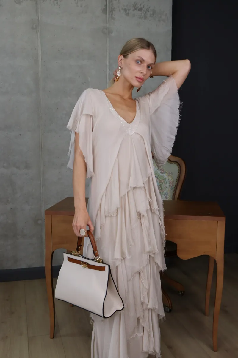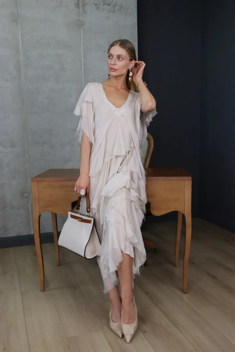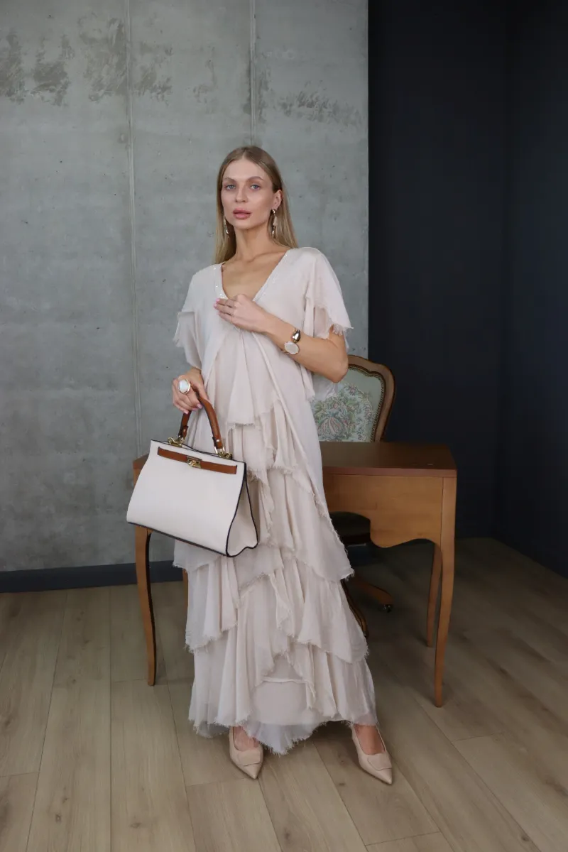 Елегантна шовкова сукня у ніжному бежевому відтінку — втілення витонченості та природної жіночності.