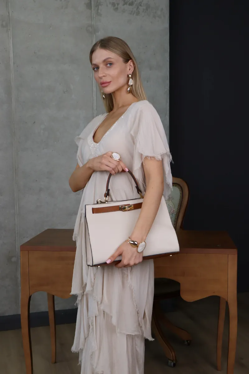 Нейтральний відтінок легко поєднується з різними аксесуарами, роблячи модель універсальною як для святкових подій, так і для елегантних повсякденних образів.