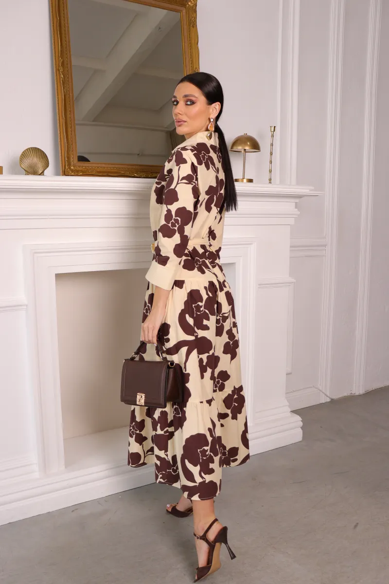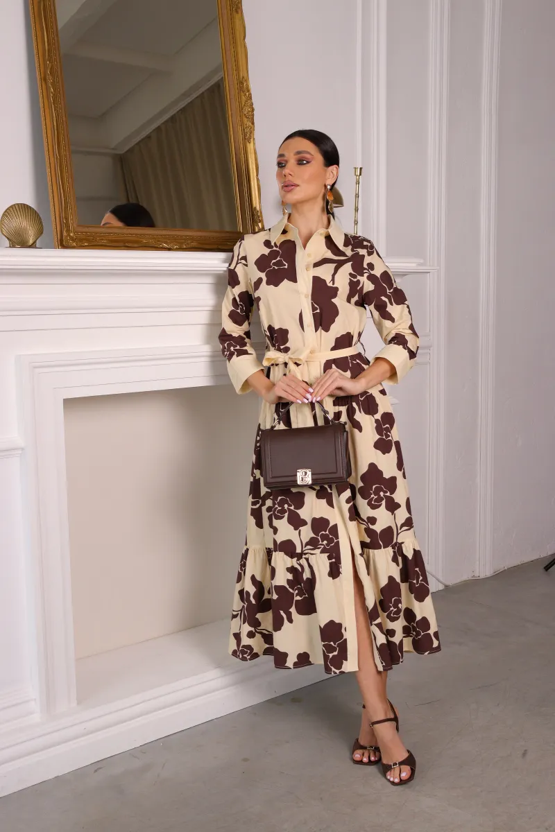Витончена сукня-сорочка довжини міді з ефектним квітковим принтом у поєднанні кремового та шоколадного відтінків.