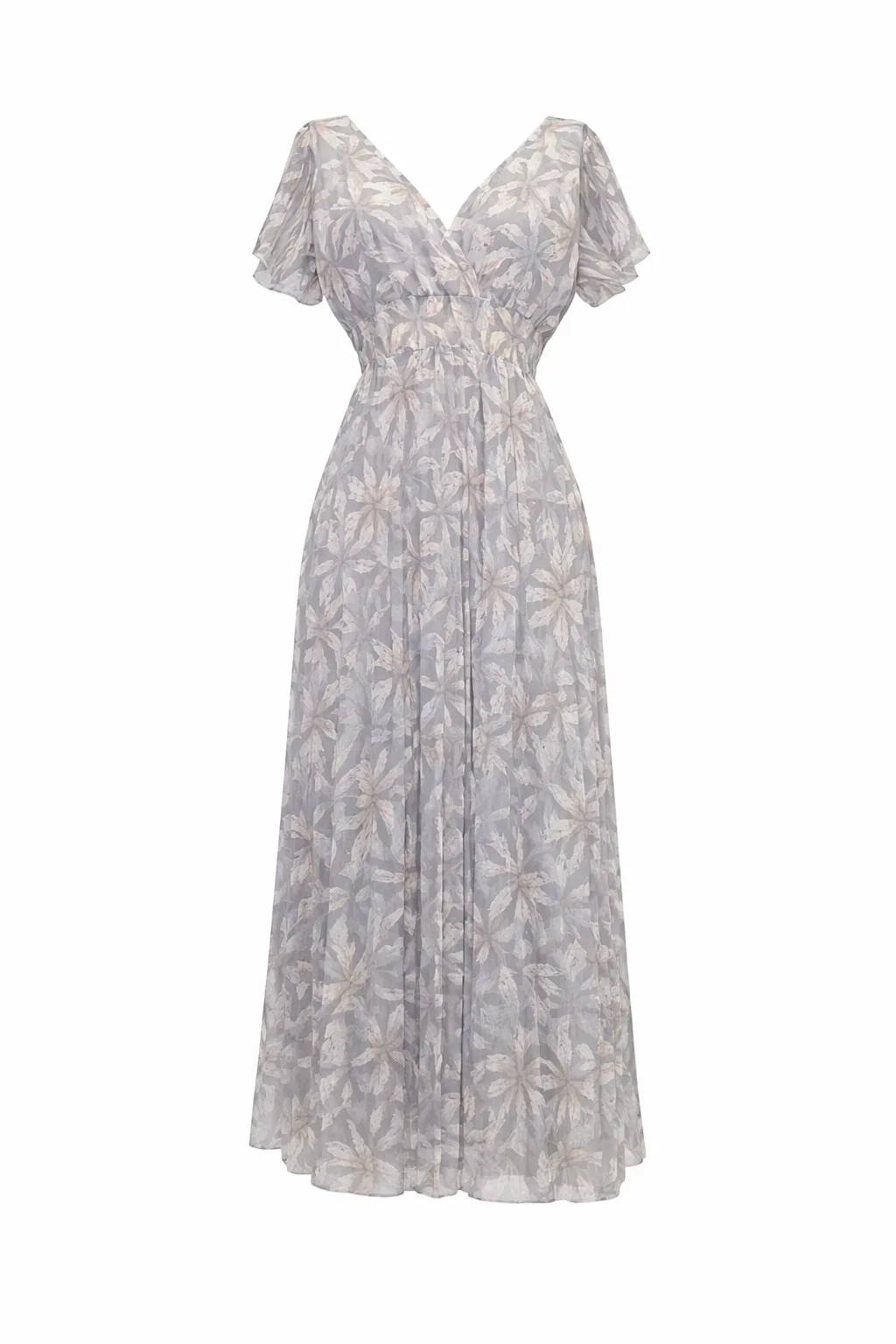 Легка та витончена сукня максі з ніжного шифону у стриманій сірому кольорі з делікатним принтом.