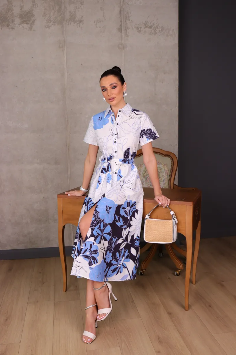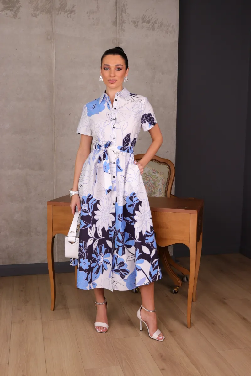 Стильна котонова сукня-сорочка довжини міді у білому кольорі з контрастним блакитним квітковим принтом.