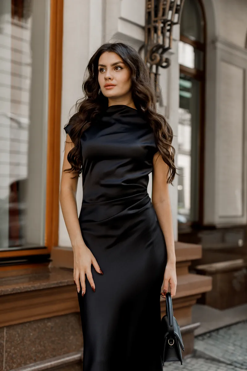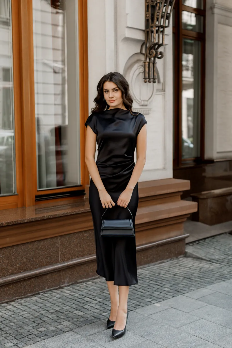 Чорна елегантна сукня з драпіровкою — класика, що поза часом