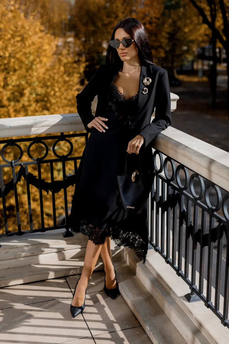 Легка та жіночна сукня-комбінація на тонких бретелях виконана з гладкої тканини чорного кольору. Модель має V-подібний виріз, декорований делікатним мереживом, що додає образу витонченості. Асиметричний низ із мереживною обробкою створює динамічний силует, ідеальний як для вечірніх виходів, так і для стильного повсякденного образу.