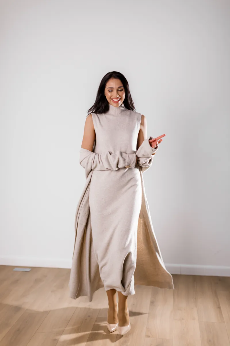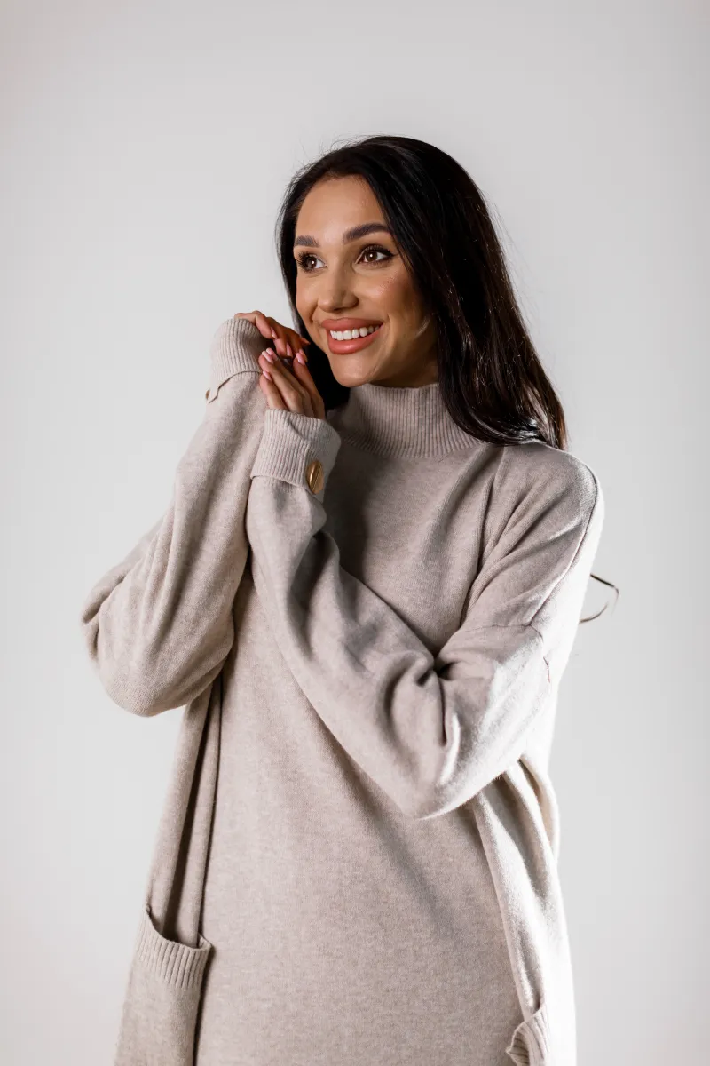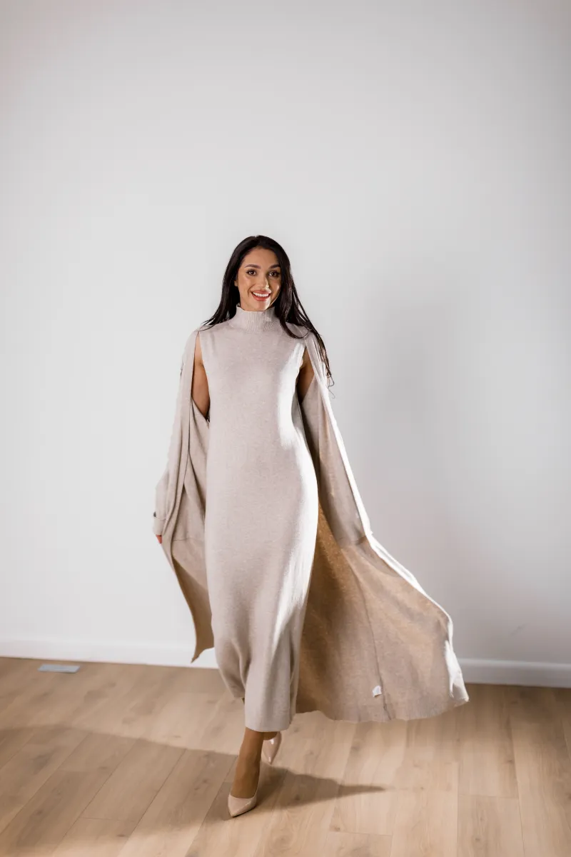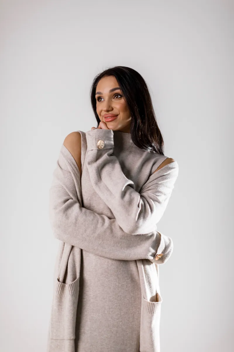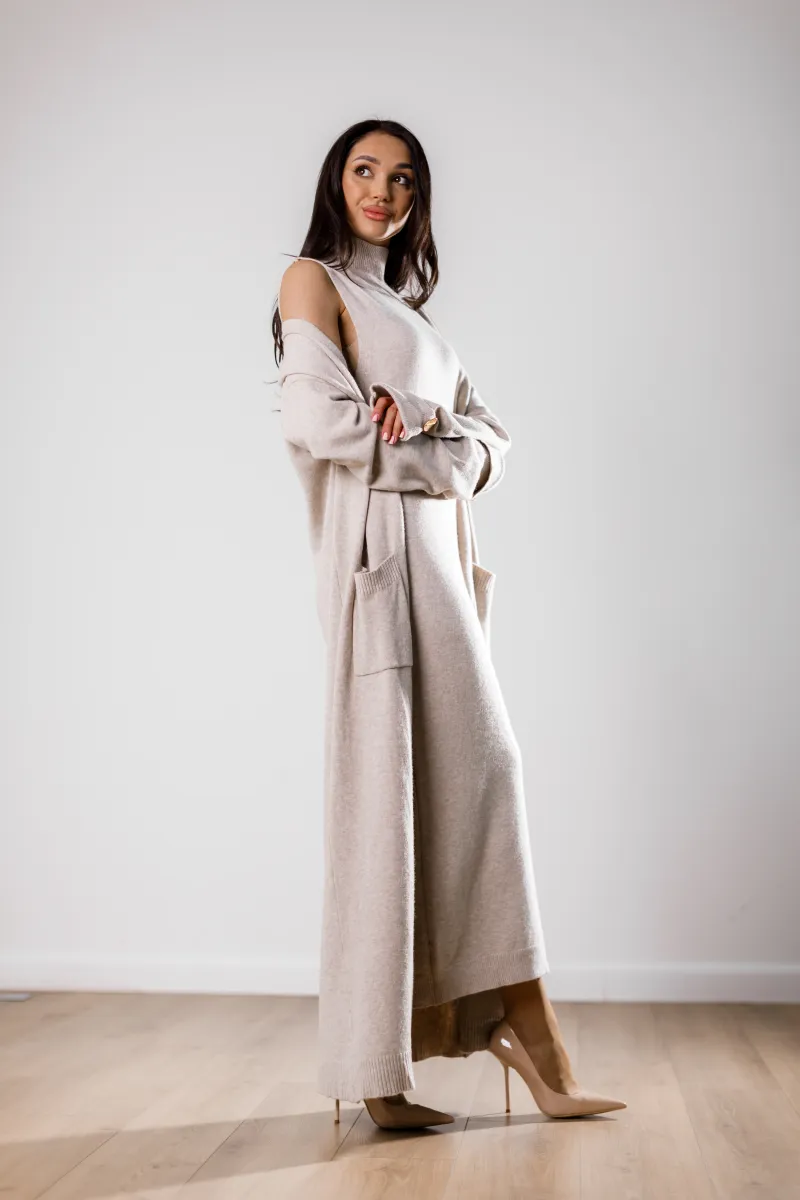 • Комплектація: облягаюча сукня підкреслює силует, а кардиган із класичним дизайном додає шарму та завершеності образу.