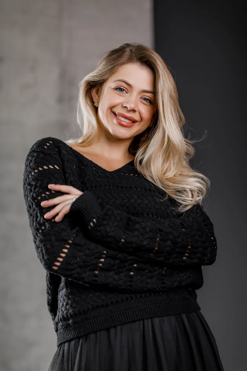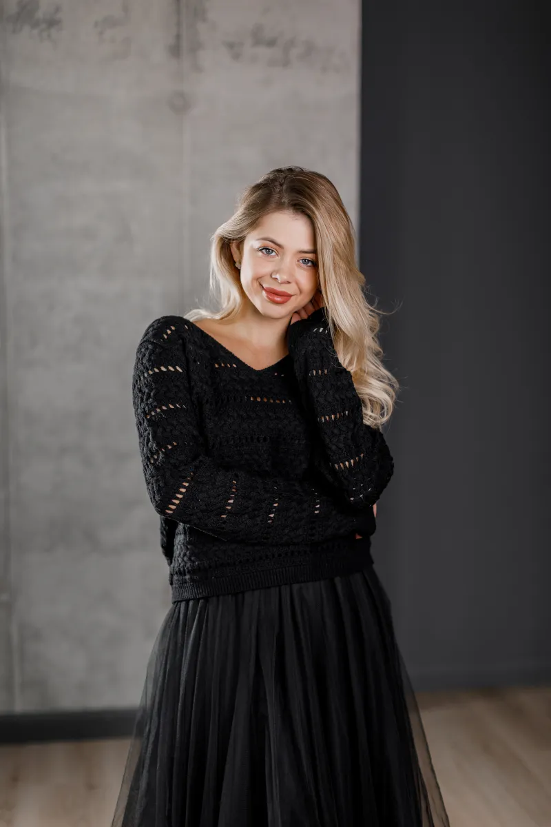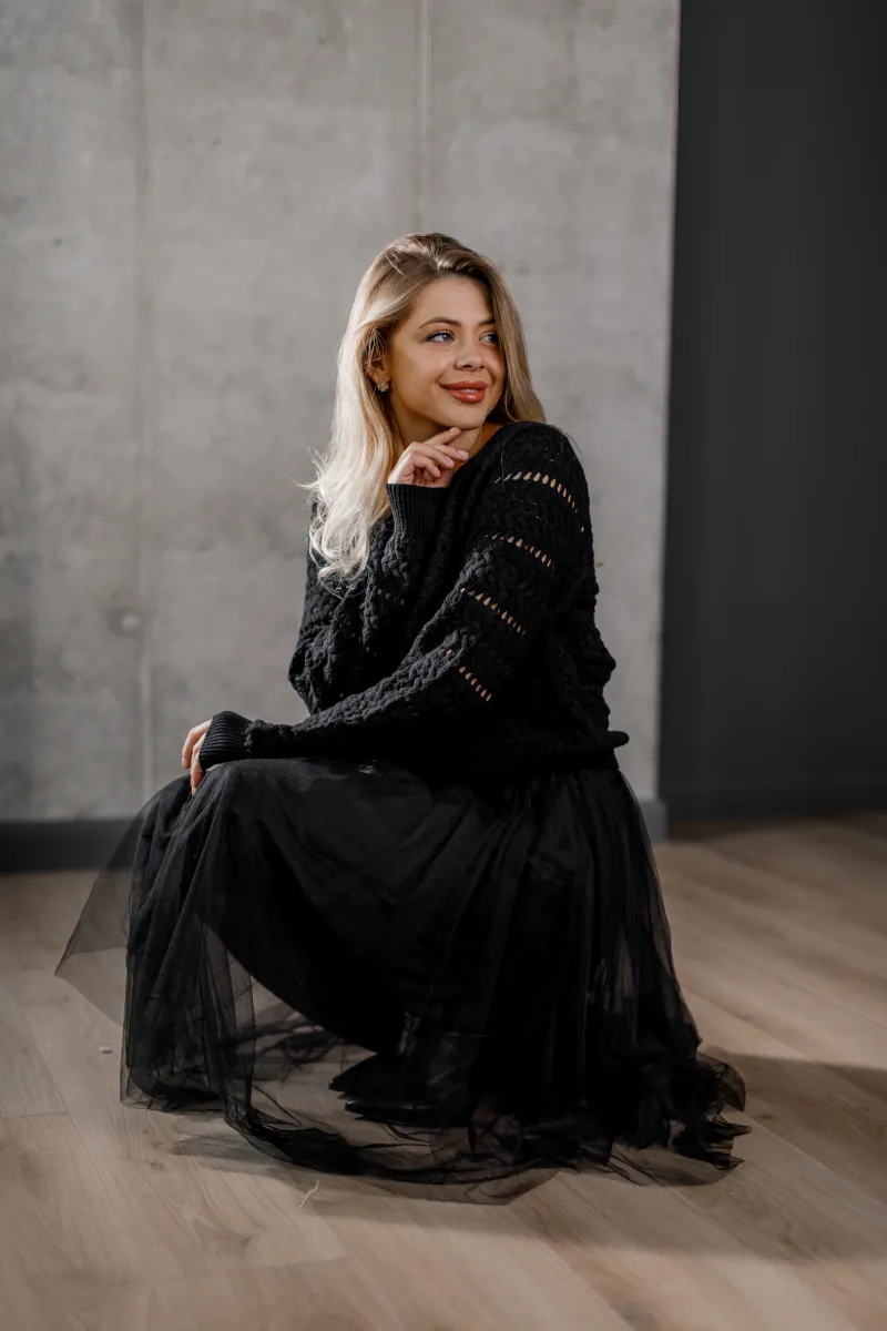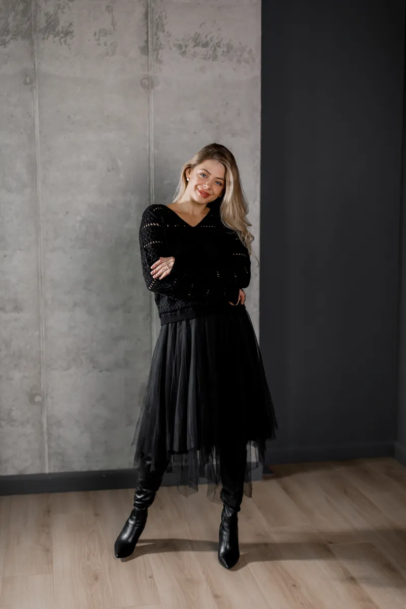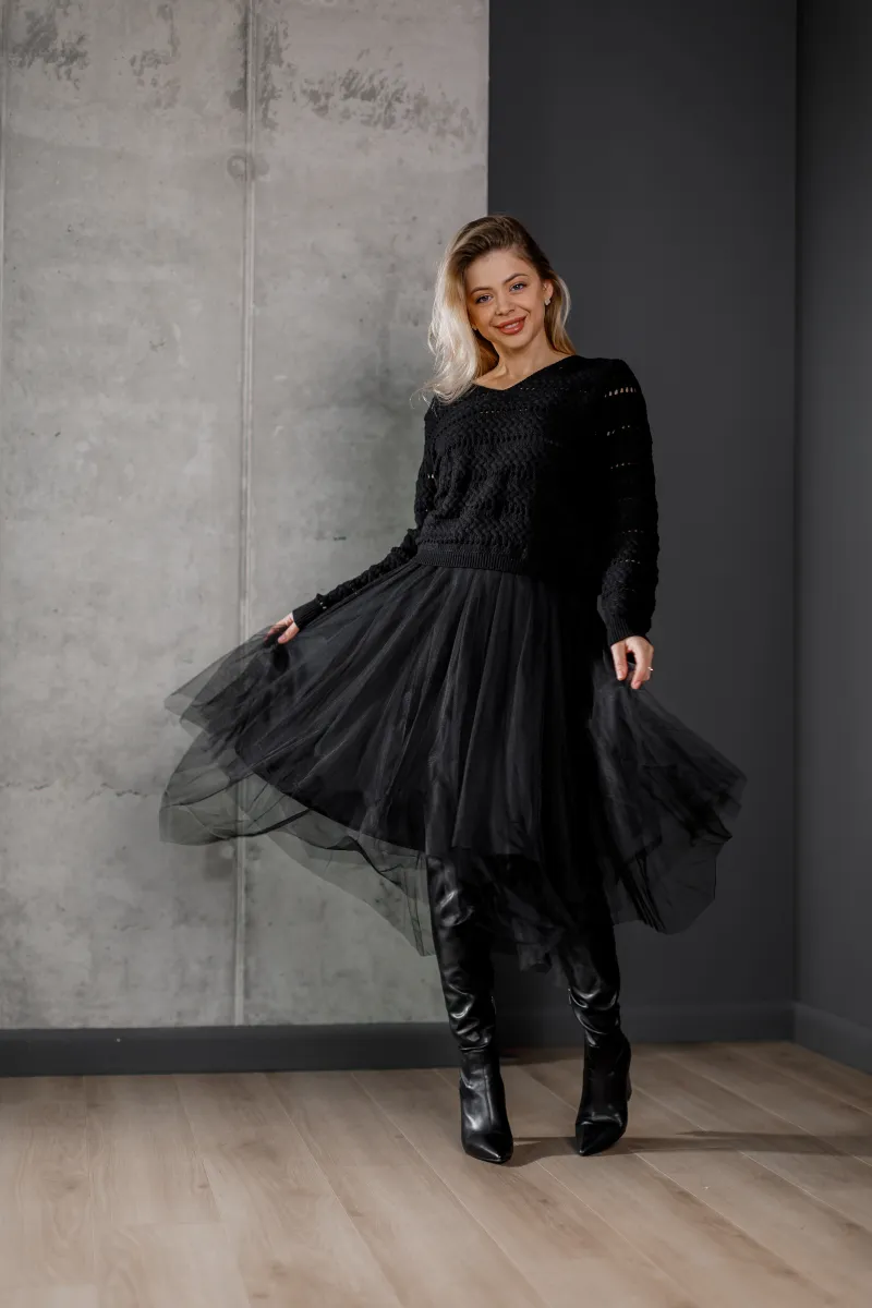 • Дизайн: Сукня з фатиновою спідницею надає образу романтичності і ніжності, а светр з V-подібним вирізом та оригінальною в'язкою додає елегантності та сучасного вигляду.