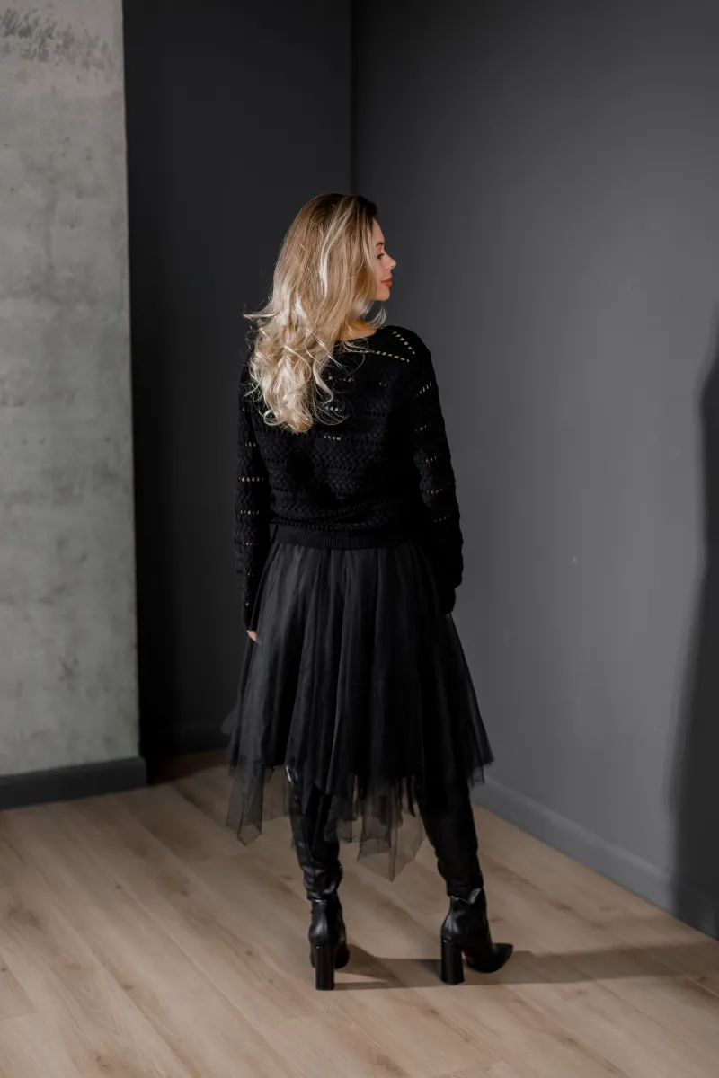 • Склад: Костюм складається з сукні з фатиновою спідницею, що додає легкості та повітряності, і светра з V-подібним вирізом та оригінальною в'язкою, що створює стильний акцент.