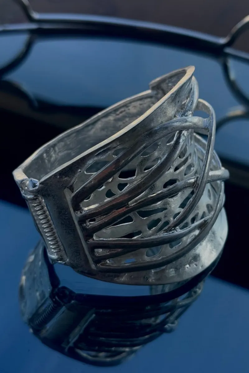 Скульптурний браслет зі сріблястого металу з ажурними прорізами та багатошаровими вигнутими лініями. Дизайн нагадує сучасну архітектуру — легку, динамічну, виразну. Браслет створює сильний модний акцент, підкреслюючи індивідуальність. Ідеальний для fashion-зйомок, вечірніх виходів і концептуальних образів.