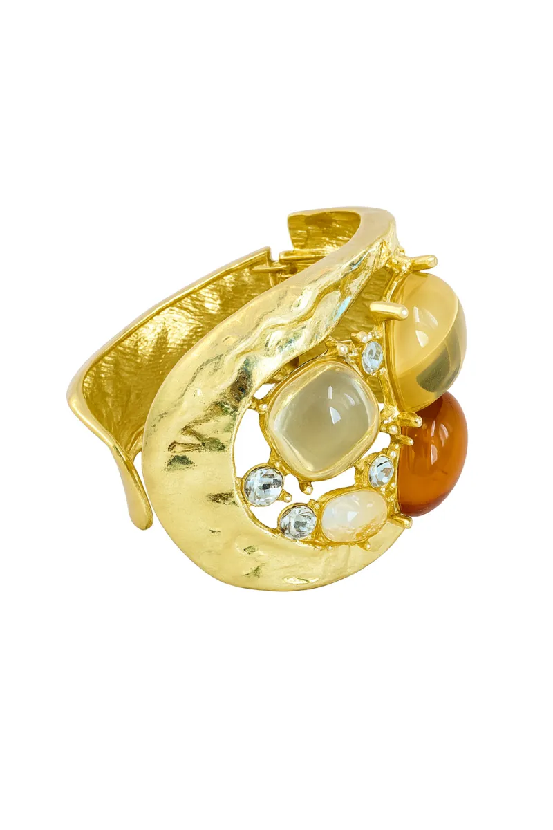 Масивний золотий браслет з багатобарвними камінням. Стиль boho luxury, фактурний дизайн, преміальний вигляд. Купити модний акцентний перстень із камінням.