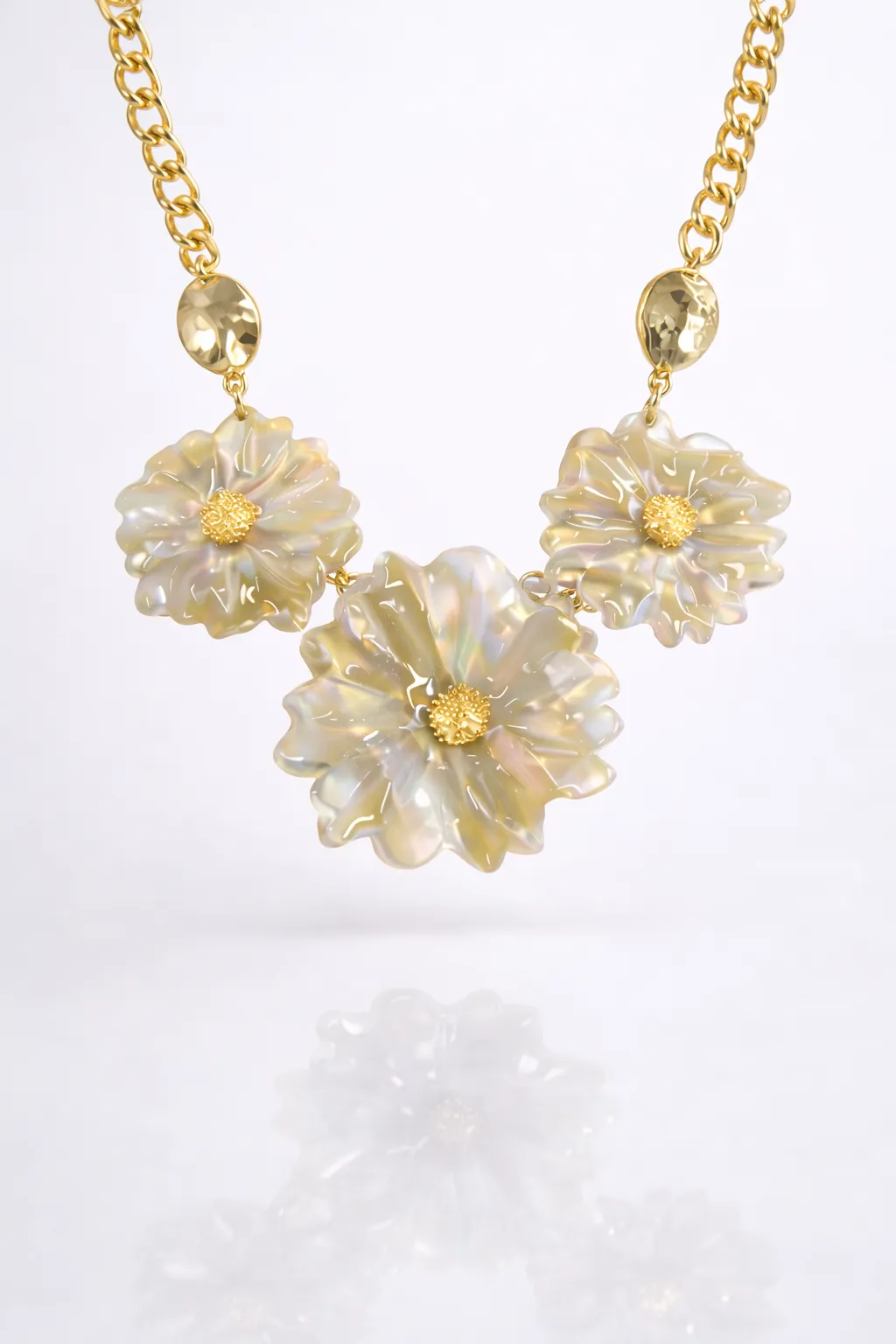 Вишукане кольє з об’ємними квітами у перламутровому відтінку, що ніжно переливаються на світлі.