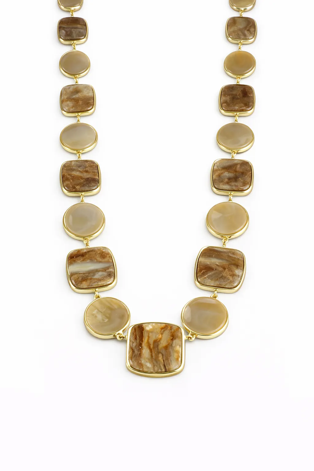 Вишукане кольє з кам’яними вставками у теплих бежевих і карамельних відтінках, оформленими у золотисту оправу.