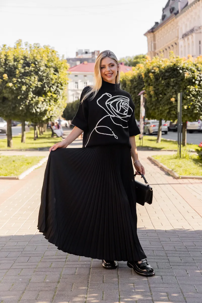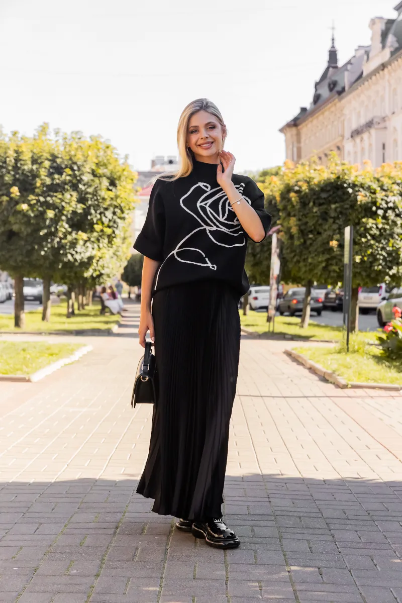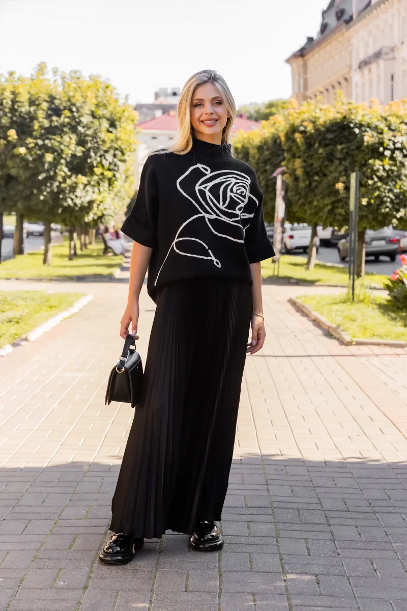 Цей светр з високою горловиною — справжній витвір стилю для тих, хто цінує лаконічність з характером. Виконаний з м’якого трикотажу, він забезпечує комфорт і тепло в холодну пору року. Особливу увагу привертає великий декоративний принт у вигляді абстрактної троянди, який надає моделі елегантного та водночас сучасного вигляду. Рукави середньої довжини з підворотом створюють relaxed-силует і дозволяють легко комбінувати джемпер із брюками чи спідницями.