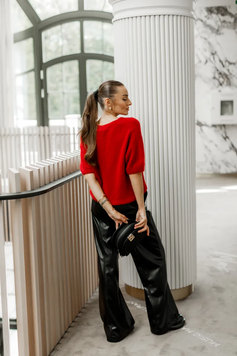 Цей червоний светр — яскрава деталь для стильного образу. Модель має вільний силует і короткий рукав, що дозволяє носити як самостійно, так і в багатошарових луках. Пухнаста текстура створює відчуття затишку, а насичений відтінок червоного додає впевненості.