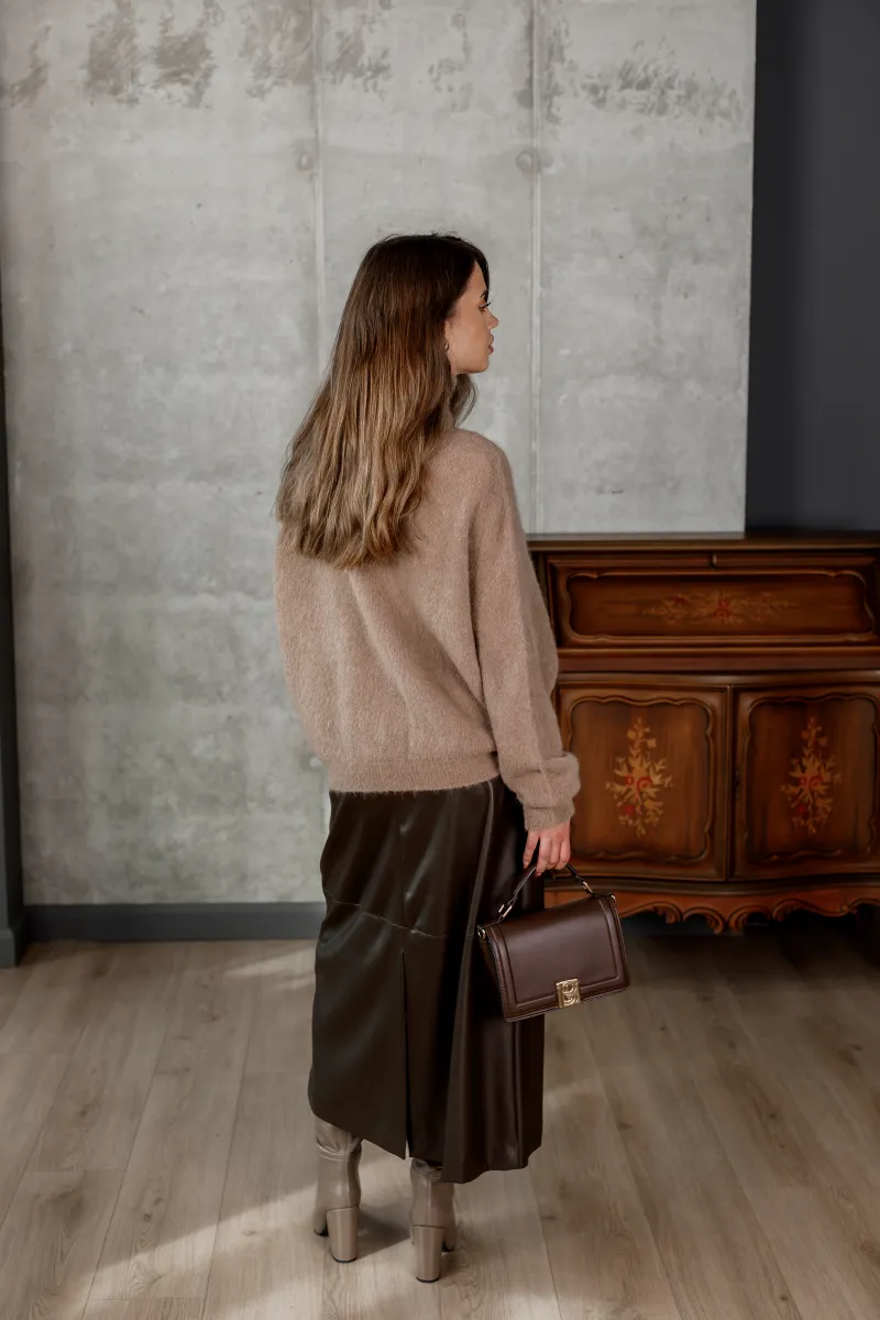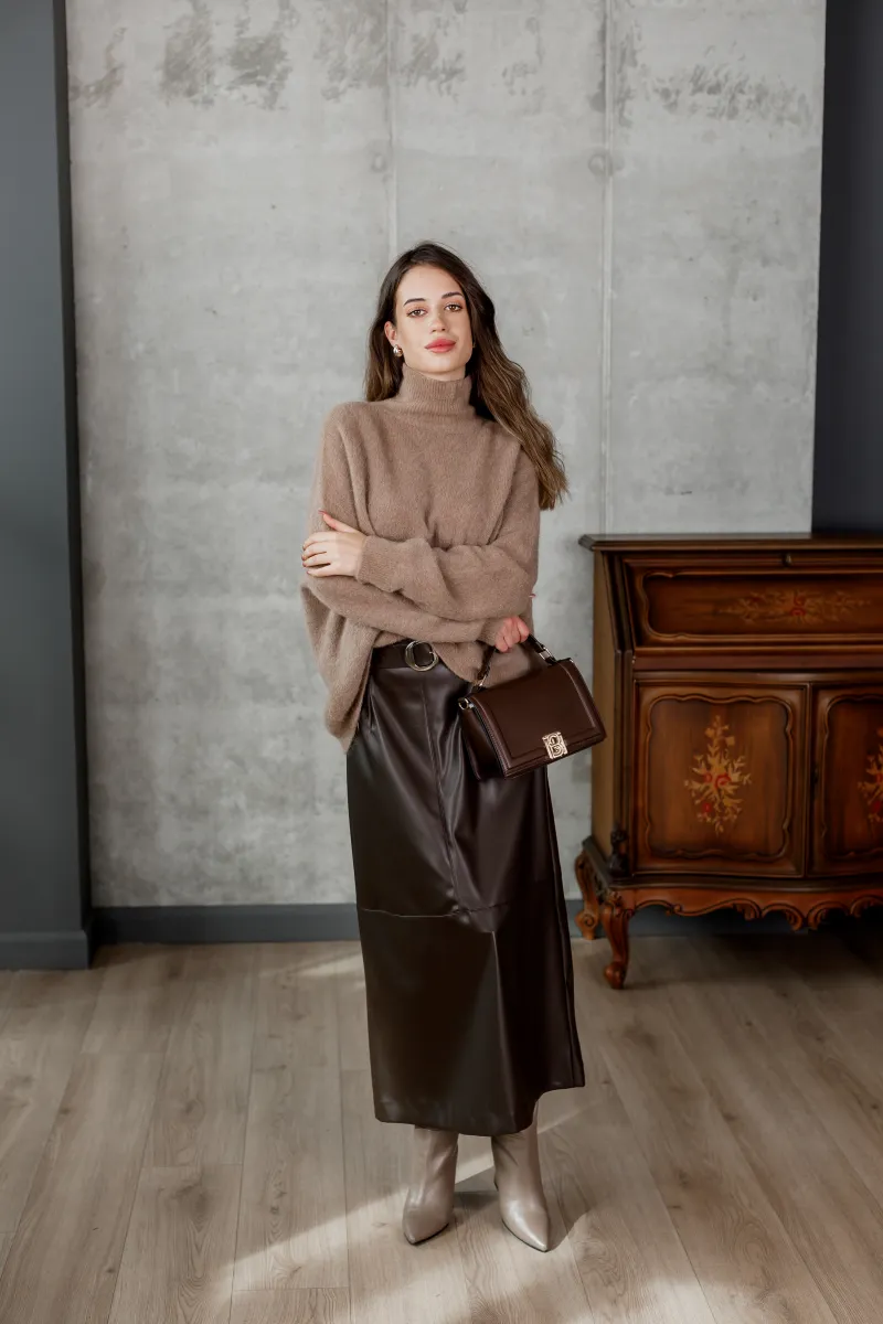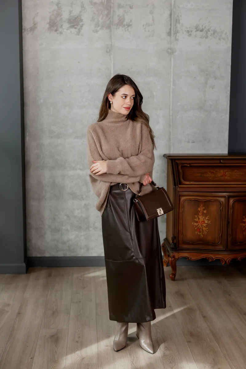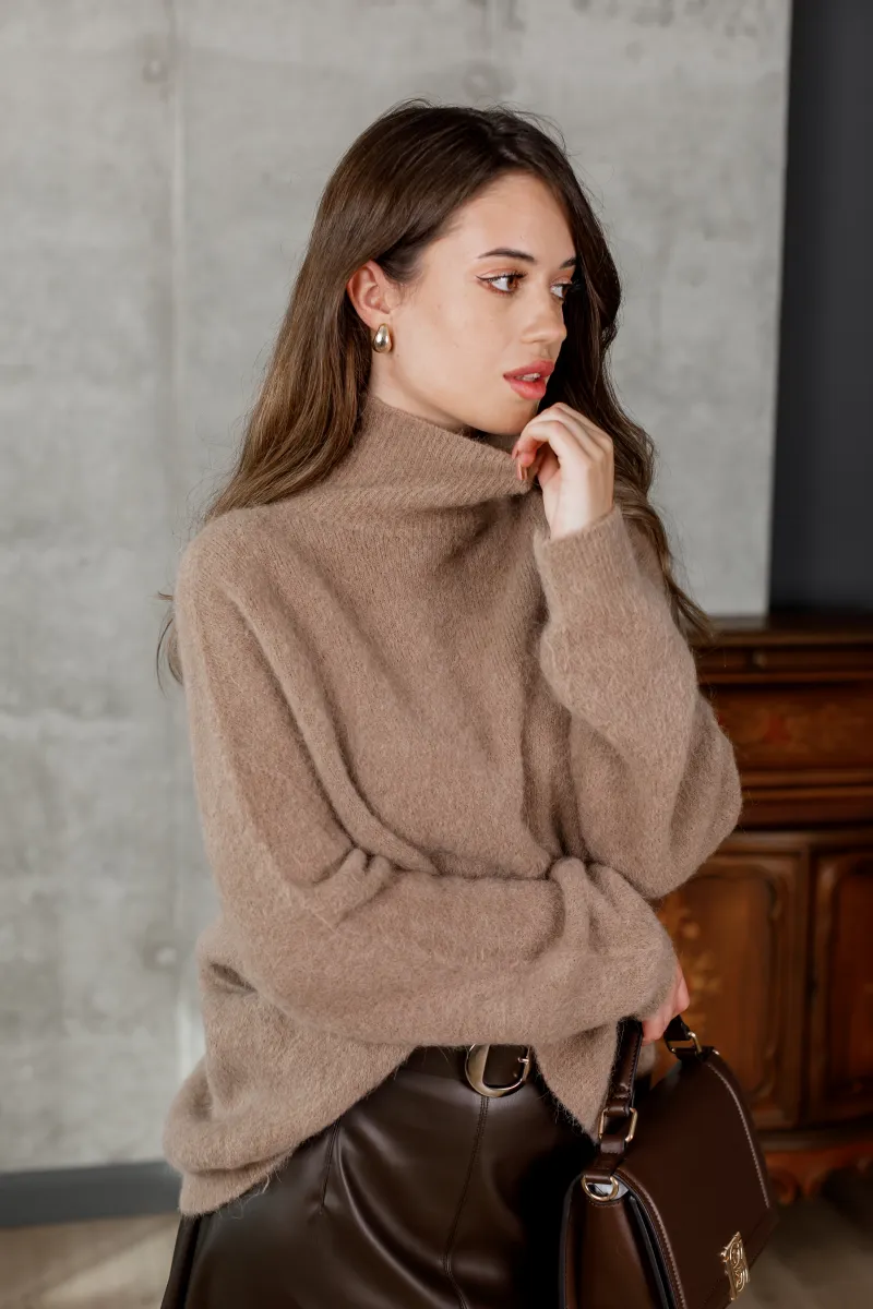 Об’ємний в’язаний светр кольору капучино з високим горлом і м’якою текстурою