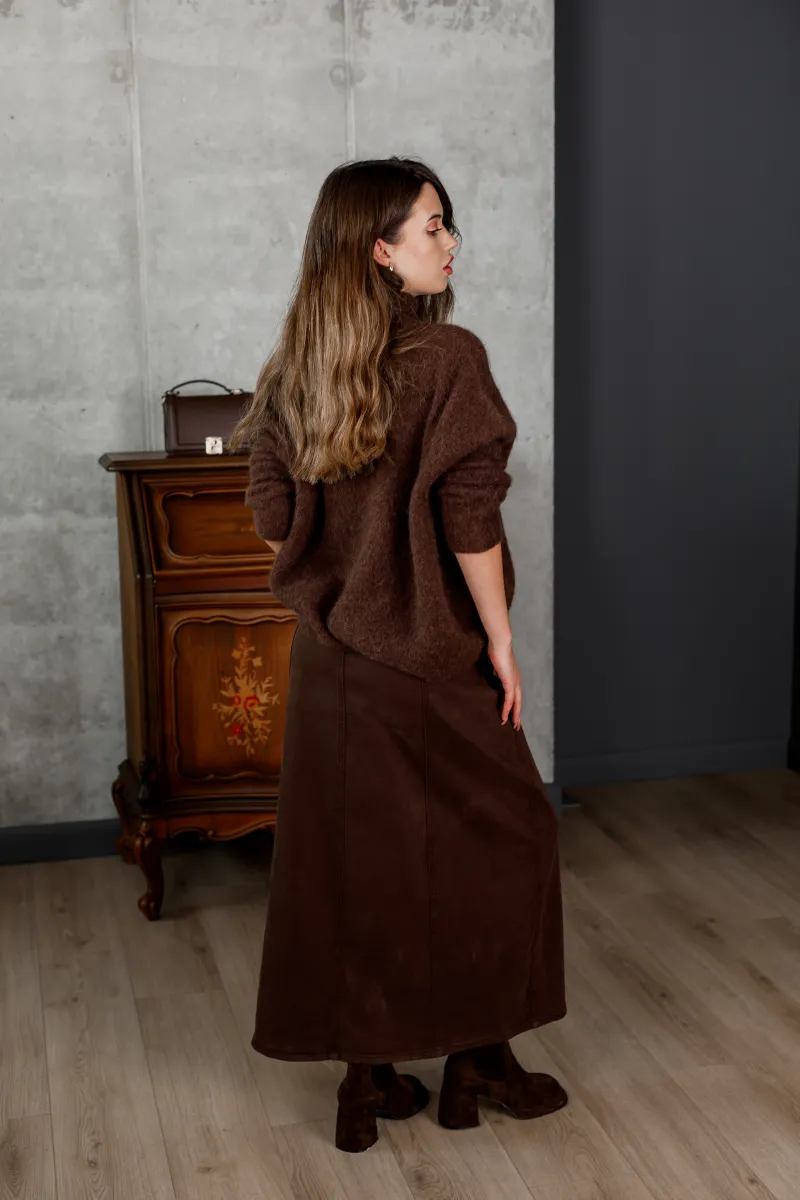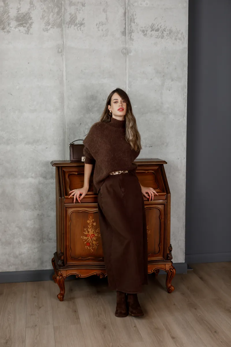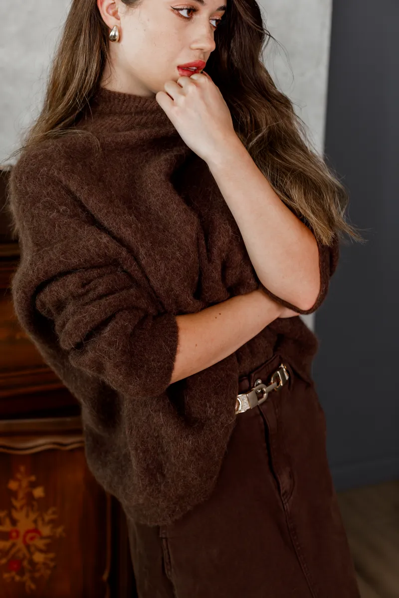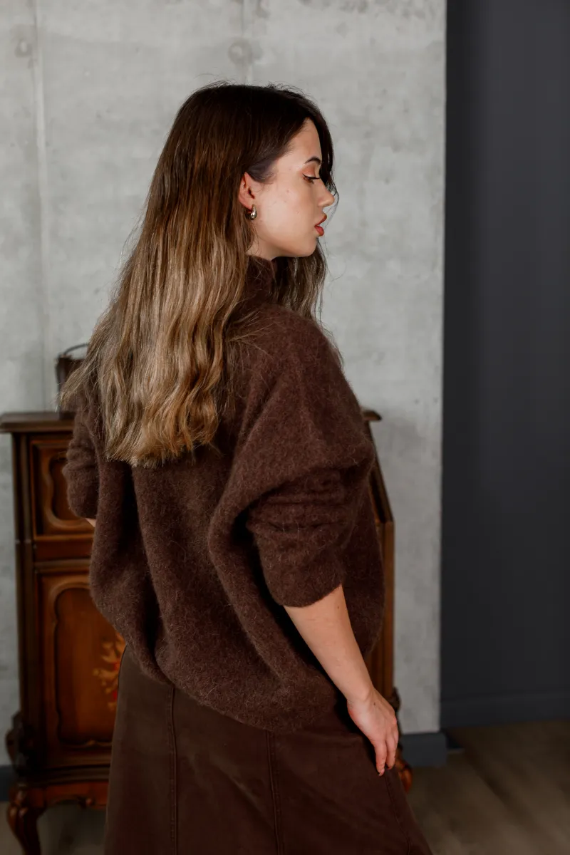 Неймовірно м’який та об’ємний светр з мохеру в кольорі "гарячий шоколад". Має вільний силует, спущену лінію плеча та високий комір-гольф. Завдяки своїй ніжній текстурі та теплоутримуючим властивостям, ідеально підійде для холодного сезону, створюючи стильний і водночас комфортний образ.